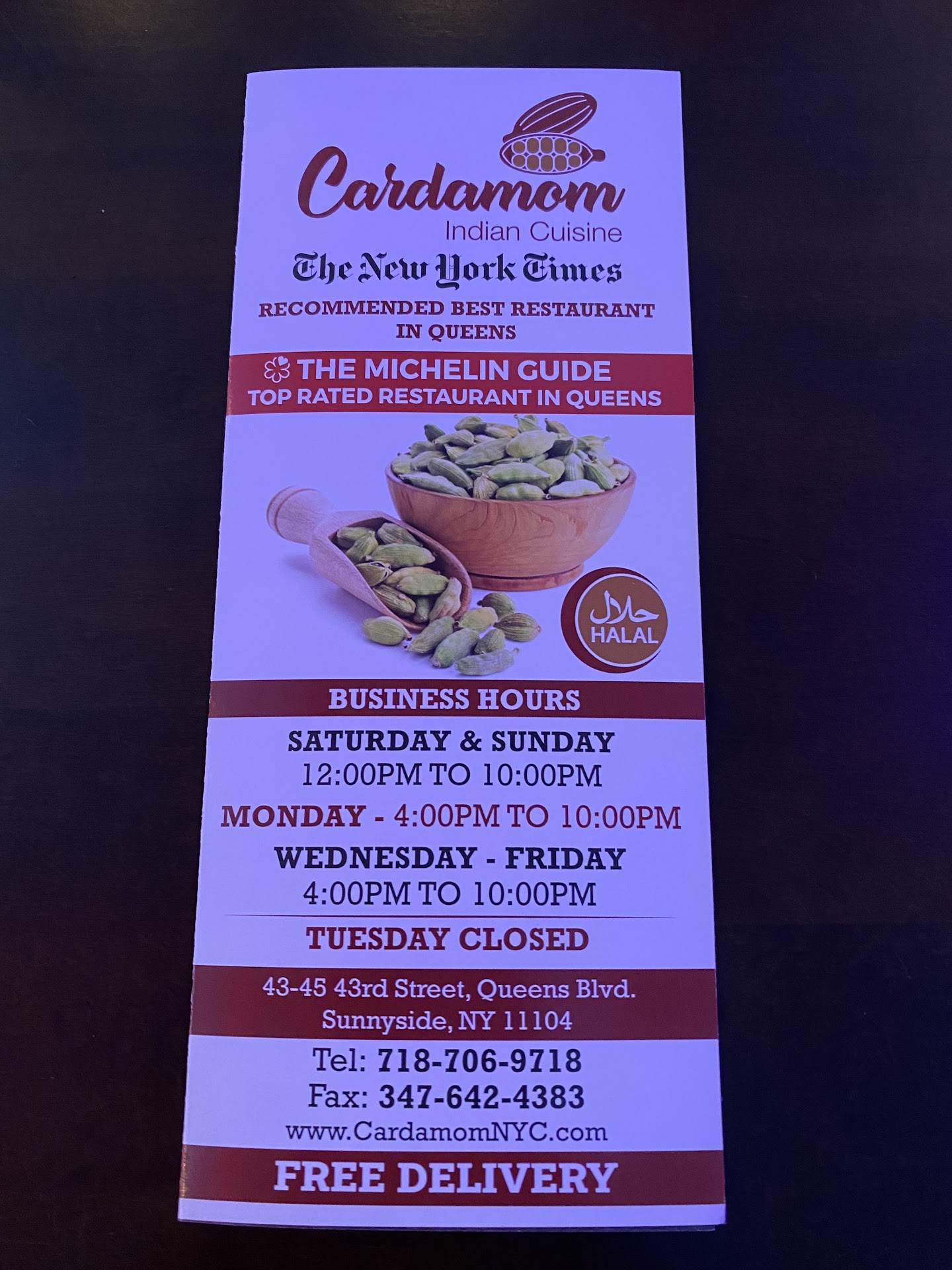 Read more9/21/22 my family an I went to Cardamom Indian Cuisine in Queens. My son-in-law had raved about this place and how good the food was. Liking Indian food I was excited about going. First and foremost we were quickly seated and our server was extremely helpful. Both my daughter and her husband have been there several different times so they knew exactly what to order. The owner came out and spoke with us and he was such a nice gentleman. Overall I saw the service was excellent For starters we got the vegetable Samosa they definitely did not disappoint it was a crispy turnover that was stuffed with potatoes and green peas the flavor was outstanding and the sauces to go with it were absolutely marvelous. Next we added the spicy lamb dish of Nilgiri Korma this dish absolutely just melted in my mouth the fresh ground met the coriander leaves in the coconut to finish it off was just one of the best dishes I’ve ever had. And Indian food. Next kind of butter chicken which is my daughters favorite dish it had yummy cubes of chicken and it was cooked in a creamy sauce I think tomatoes and yogurt gravy oh my goodness it was just lovely. Another dish with the Vandeloo spicy ham oh it had curry and rice coconut finish we got every one of these in spicy because we love the hot spices. She cut me a meal we got the garlic naan bread with cilantro and then again we got one of my daughters favorites which was the tomato rice basmati rice was flavored very well and was also excellent. If I could give Michelin ratings this would be one that I would write about and give stars to. I know Main‘s to we finish all of this meal. So of course we took home leftovers for later. And I said a touch the meal was a wonderful little ice cream dessert with that little round cake tasted like it had been soaked in honey. Which only complemented the mail more. Thank you for a Memorable meal and...