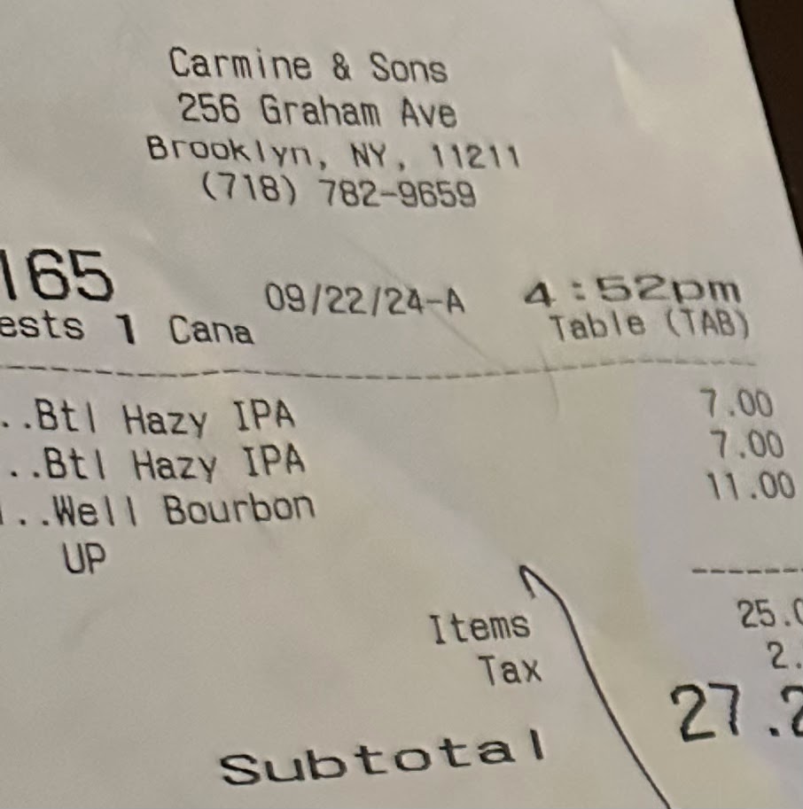 Read moreI'm very upset I just bought a 18" PECORINO ROMANO PIZZA Costed $20 and didn't even taste the rest of the ingredients all it tasted more like was the NY STYLE CHEESE PIZZA. it was very cheap I barely saw any pecorino cheese any where. if it was gonna come like this I could have saved money buying the NY STYLE CHEESE PIZZA. but since I had no option else to buy food time was ticking. so I bought from Carmines I was hungry and still ate from what I ordered. it arrived on time but was burnt and wasn't even hot pizza not even warm it was straight up cold. I mean seriously I gotta think about it was my entire pie sitting hours on the pan and since they were lazy enough to give me a fresh made pie they thought I wouldn't notice the looks and taste I mean others might love this place but these people have no passion in making pizza at long as the money is flowing until one customer gets sick from their food they're screwed out their asses MERRY CHRISTMAS by the way I'm also writing this review just in case I'm dead I got proof through the emails GOOD LUCK and one last thing all the pizzerias around taste better than Carmines if ya wondering why didn't I buy from others well I'm more of a food taster trying to nail the best pizza in brooklyn reviews are important to read and if you want to give this place a try go ahead and when something goes wrong you'll think of my...