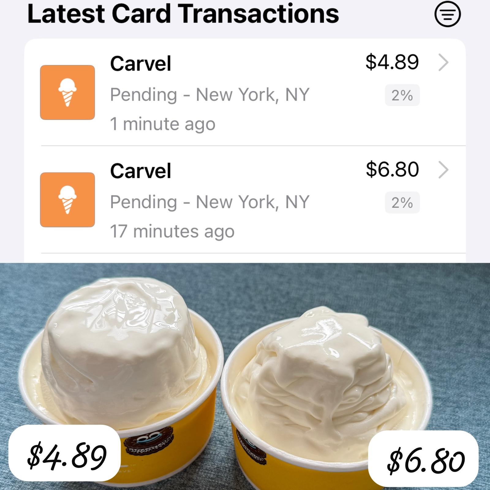 Order two kids cups with toppings. 1 small cup no toppings. He charges me $19.87. When I ask why it’s more than what’s posted he points to a tiny sign bottom left of the case with pricing for ice cream versus the giant sign hanging above the case which doesn’t specify soft serve ice cream pricing only.