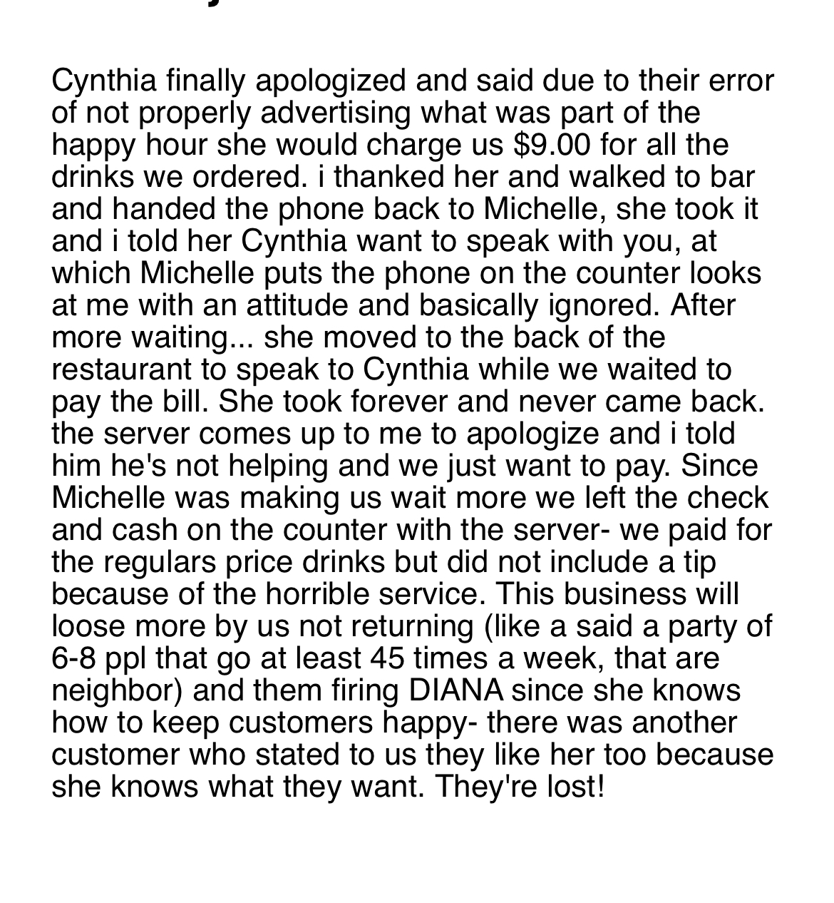 I live in the area and have been going to Andreas since they opened for the food and happy hour deals they have. Unfortunately, yesterday I had a very bad experience with the waitress Michelle and the server (don't know his name) or usual waitress DIANA (I believe is her name she is the best!) was away. Anyhow, when we arrived at about 6pm the place was really hot so we asked Michelle if we could open the windows since we were at the table in the front of the restaurant but she would turn heater off which was fine it got cool pretty quick, she then came to our table with the menus, my family and I a party of six ordered our food and I attempted to order a margarita and Michelle stopped and said to et her put the food order in first and then she would come back to get the drink order- I found that odd because at any restaurant drink orders are done first... after about 15 minutes or so she comes back and takes our drink. My family got our usual margarita and some got mojitos those are part of the happy hour specials. My family and I continued conversating, I look at the bar and I tell my family these drinks are taking really long to come out (mind you the place was empty like most of the week days me and family go). We continue to wait when i look at the bar again and Michelle is taking pictures of the drinks we ordered like we weren't waiting for 30-40 minutes. The drinks literally came at the same time the food came out. I told the waitress the drinks are beautiful but this is why drink orders are taken at the beginning because now it's difficult to eat and drink at the same time. My family were hungry so we ate. After about another hour, an finally finishing my drink we asked for the check... after Michelle ignoring us and checking in on us. When we get the bill Michelle charged us regular price for the happy hour drinks that were suppose to be $9.00 the whole day as they has advertised by the bag and at the front of the restaurant. "All day Happy Hour" Margaritas, Mojitos etc $9.00. after a few more minutes of waiting (mind you the restaurant is still empty only about 2 ppl at the bar) we finally get Michelle's attention to discuss the bill. Michelle acts clueless and says she doesn't know anything about happy hour, so i told her look at the sign at the bar and sign in front of the restaurant. We explained to her that we're regulars and we're usually charged $9.00 for classic flavor margarita or mojito and additional $2.00 if we want a flavor. So she goes back to the bar registers, and after more waiting she's on the phone with the owner, comes back to our table to let us know that promotion is only for the Bronx location and that only classic flavor were apart of the happy hour- so i asked a waitress when did you explain that to us... you didn't even know it was happy hour. The whole time we're there Michelle's attitude was ridiculous and I got fed up and I told her you know something that has been the worst service we've had here and as a reminder we're regulars that are usually a party of 6-8 ppl and you're really rude and we're not going to want to come back. And i asked Michelle to please pass me the phone because the owner needed to know how we were treated since we walked in. After more waiting... the owner I guessed called back and Michelle had the server bring me the business phone. Cynthia the owner explained that the usual waitress DIANA would be getting fired because the additional $2.00 flavor drinks is not a special for the happy hour. I told Cynthia that's not something she should be telling a customer that I wanted to speak with her about my experience today, so I went on and explained everything I wrote on here from beginning to end. Cynthia continued mentioning to me the firing of DIANA- and i explained to her that she needs to fire the waitress and server that took care of us today. to be continued.. exceeding characters. see photo for...