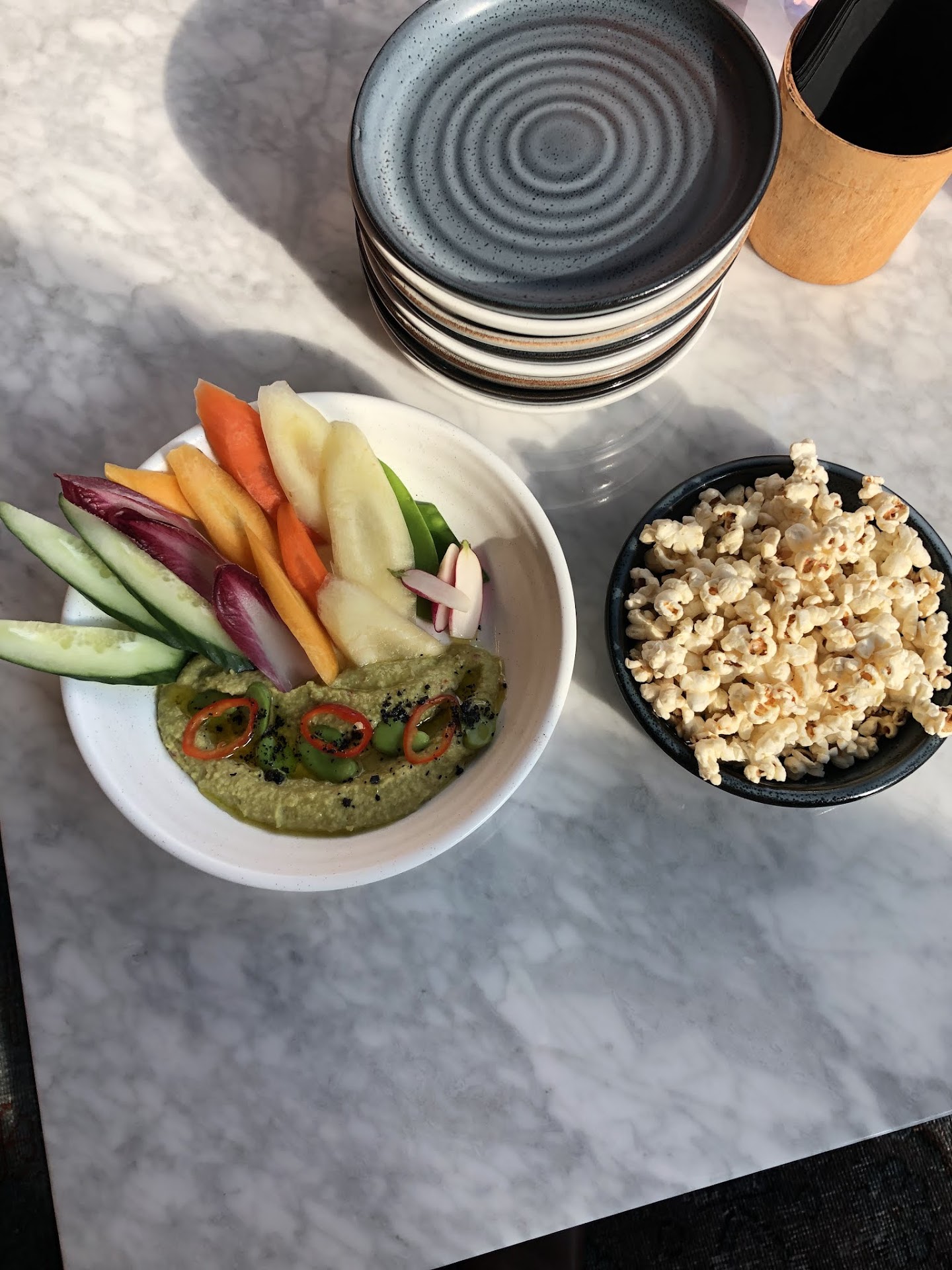 Read moreIt's a spacious spot to grab a bite if you're tired of delicious food from little Spain next door. We had the sausage wrapped in puff pastry, the deviled eggs, the grilled cheese sandwich, the crudite with fava bean dip and the crab dip with Bugles. It all seemed to be very tasty. I love the dishes that they use there. Have a good system for keeping track of everyone's check separately that I really appreciate it because we were with a large group and these things can get confusing. If you have had a long walk on the highline and need a refreshment this is a good spot! They do big business right before the shows at the shed start so it gets quite quiet right after...