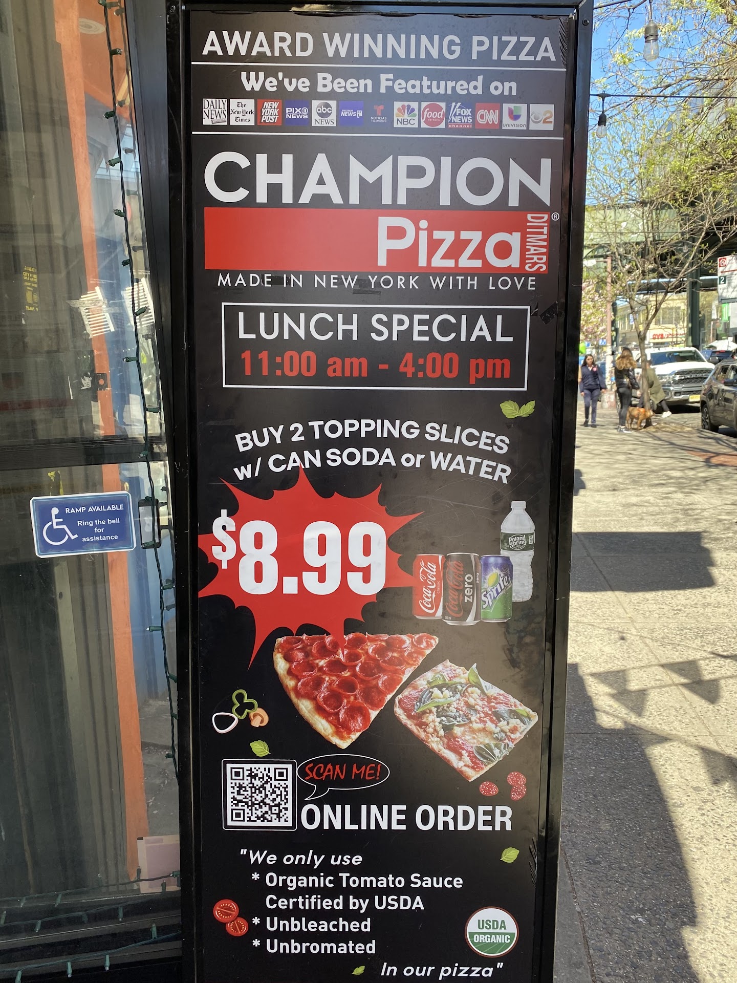 Read moreRooted in NYC with 7 pizzerias, Hakki Akdeniz, the owner and founder of Champion Pizza, customizes pizzas based on the neighborhood. Located just a walk down from the N train station in Astoria, my cousin and I came today to their Ditmars establishment for a quick bite while running an errand. The cozy interior with six tables has just the right amount of classy atmosphere, with stunning photos and articles on the wall about how great this business is. It offers 35 different styles of pizza, way beyond the number that most shops sell. We decided on a slice of the Margarita Pesto (homemade marinara sauce, mozzarella cheese, parmesan cheese, pesto sauce, olive oil, and fresh basil) and Bacon & Pineapple (homemade marinara sauce, bacon, pineapple, mozzarella cheese, parmesan cheese, olive oil, and fresh parsley). The square slices were just absolutely amazing in crunch, flavor, and freshness, made with all natural organic ingredients. The price was favorable, and the staff was friendly. We can...
