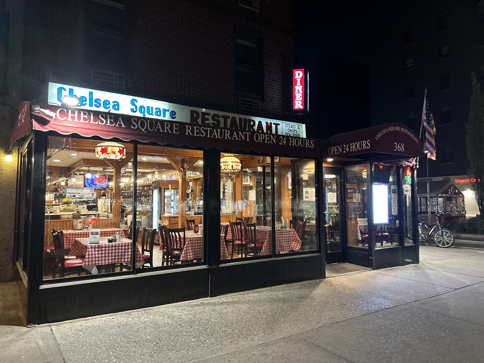 Read moreCame here with a group of friends after a late night ice hockey game at the Skyrink on Chelsea Piers. Menu was very simple for a diner (I'm used to the massive NJ diner menus) and not looking to spend too much, I opted for a bacon cheeseburger with mango habeñero chicken tenders to share. One of the other patrons ordered chocolate chip pancakes. When the food came, they brought her a chocolate shake (not chocolate chip pancakes) and the mango habeñero never came either, instead we received buffalo sauce, which was the only other option for the chicken tenders. Not wanting to send another item back, we chose to just eat the buffalo chicken tenders. I do feel the burger was decent, large and compared to other menu items, I felt was fairly priced. Some other items I thought were pretty high ($22 for 4 chicken tenders and French fries). I understand...it's NYC prices, but this is also a diner, not an upscale eatery. I've spent less on very nice sushi rolls than those chicken tenders, so if I'm using that as a measuring stick, I did feel many items were over priced. For a late night meal after a game (and everything else is closed)...it fits the bill. But if anything else is open, I'd personally...