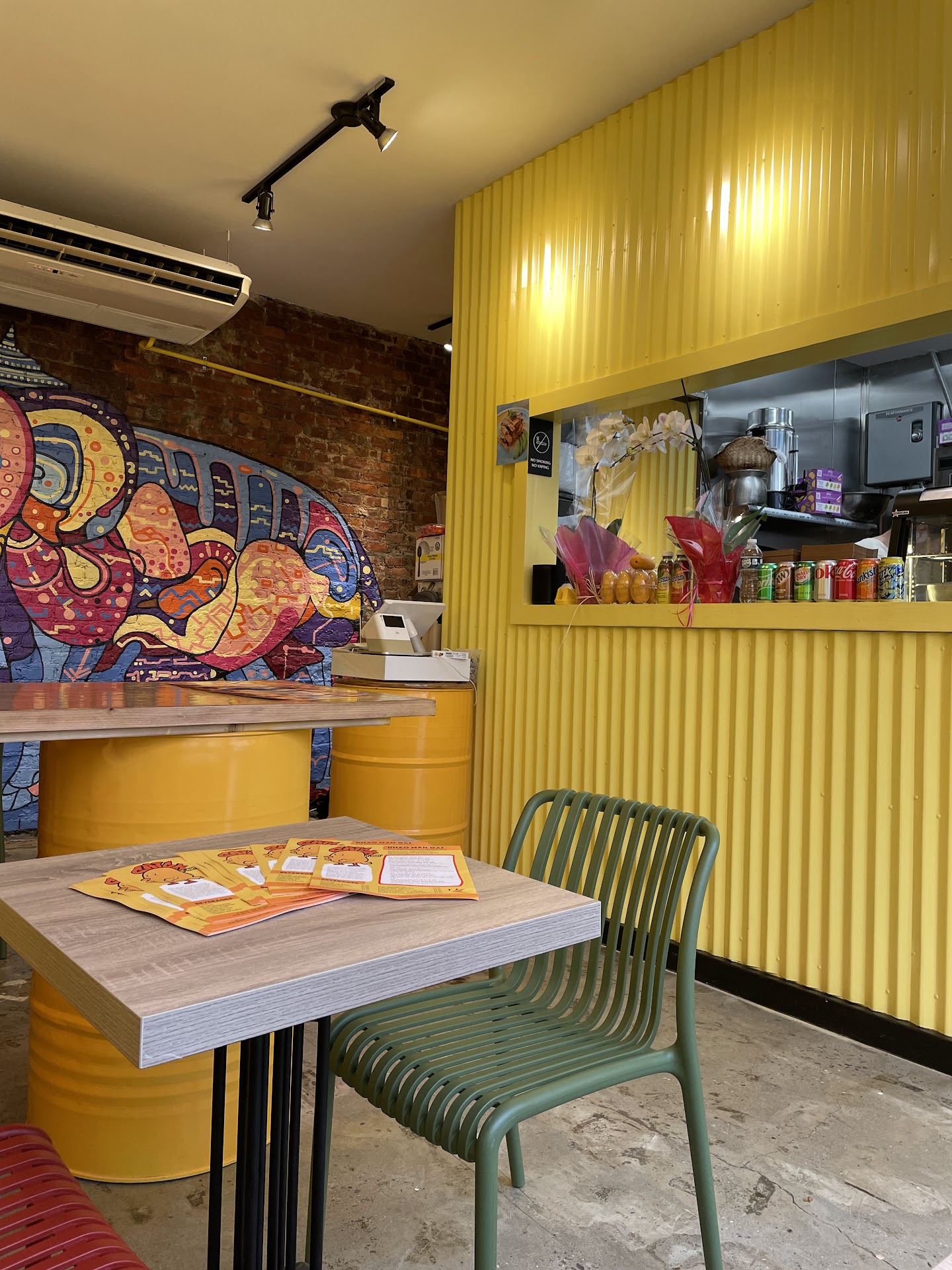 There arenāt many places to get Thai style Hainanese chicken in Astoria so itās nice to see this type of restaurant open on 35th Street and Broadway. The restaurant is small with about 4 or 5 tables. I love the aesthetics inside with the exposed brick wall and the hand painted mural; very cute. The menu is small with only 6 chicken dishes to choose from. In fact, there are more beverage options that food.