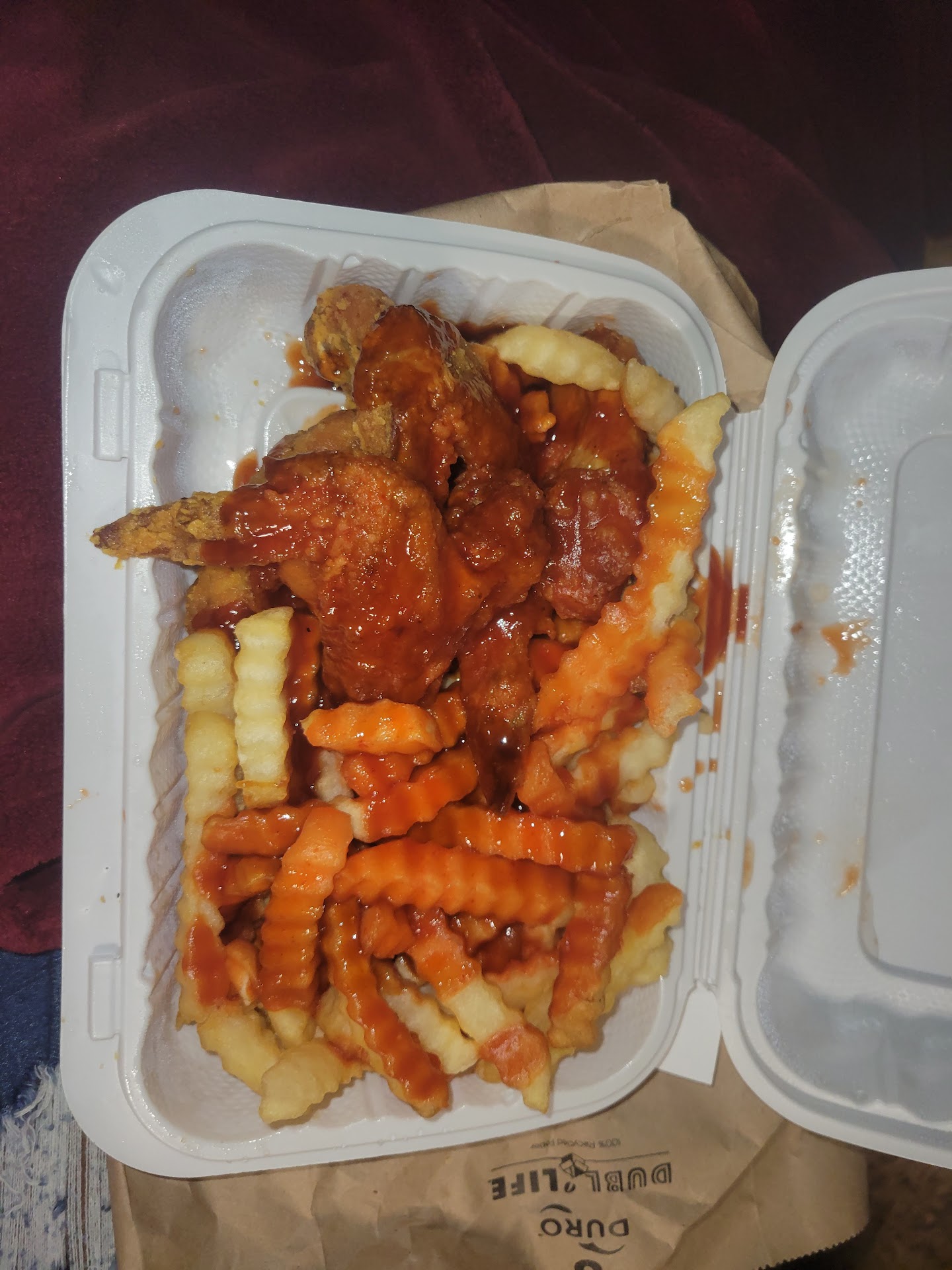 Im not sure where the chinese store get their wings from now but since the pandemic the prices went up and the portion and sizes went down. The wing were small and the fries were not well cooked. I ask for hot sauce,bbq sauce and ketchup and seem like i only got hot sauce and ketchup which was lil to spicy for me. We also got ice tea and lemon tea I tied the ice tea and it was little sweet so had to add a little water. I wanted to order from here because one of the pictures the wings look like decent sized.