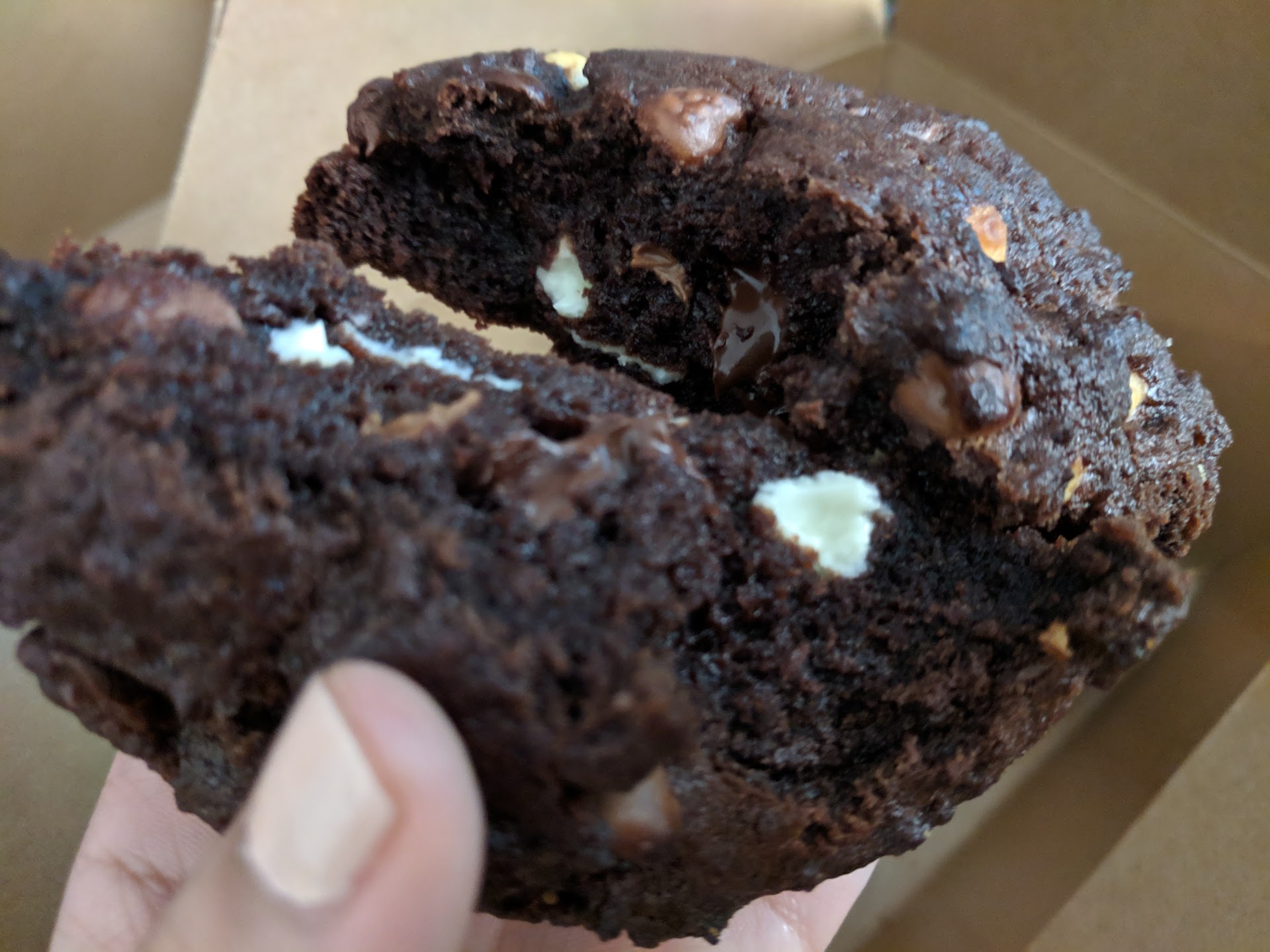 Read moreIn between 3 and 4 stars. This place is right next to my house I go here pretty often. I have to say it is really good and really well baked, but it's sometimes it's too much chocolate and it can be very very overpowering. You would always need milk or else you feel very very bad. I don't have a huge sweet tooth, which might be the reason, but for every let's say morsel there could be anywhere from 4 to 5 chips. That's a lot. Like you barely see any of the dough. If you like that this place is the place for you! If you don't, try the walnut choco chip which is still too much or the salt choco chip. I'd say that helps. But my fav is just reg choco chip. I'd still go haha but it's just...