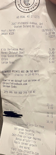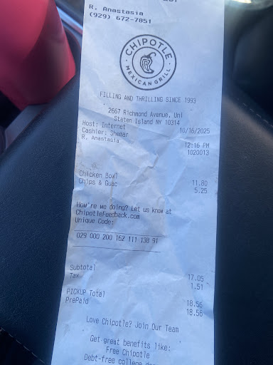 On October 16th, 2025, I accidentally placed a pickup order at the Chipotle located in Staten Island, thinking it was the New Jersey branch.