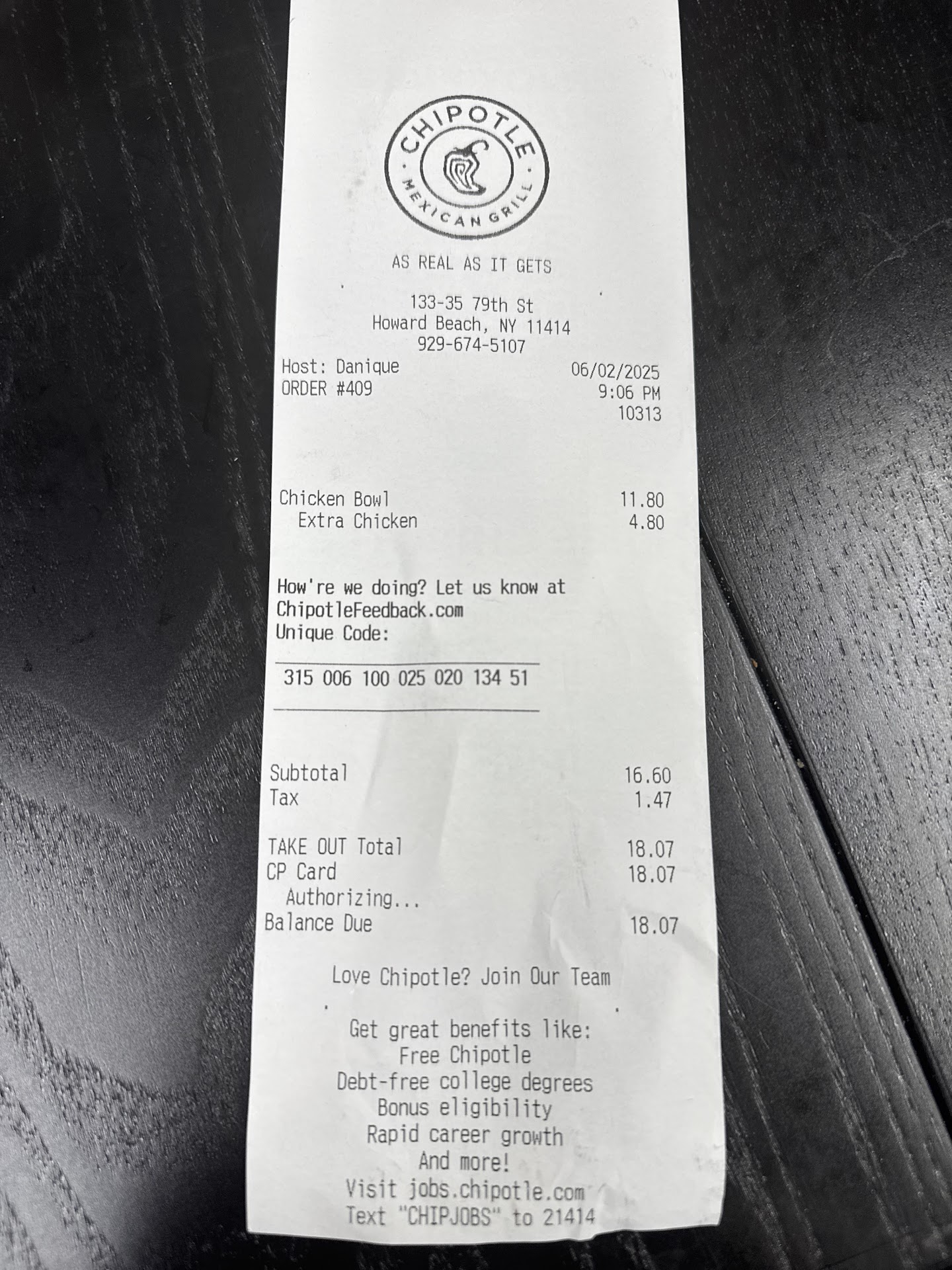 Ā Ā Ā Read moreI brought my team here last week during the day and the energy was high, positive and welcoming⦠All imma say is that the infatuation phase is over šš¤£ Today I Ordered plain chicken, beans, and lettuce. I really would have prefer more lettuceš (lol you canāt ever win with chipotle; itās either more carbs than meat or the opposite)⦠Also⦠I was charged $18 for my meal⦠I just went to chipotle on Saturday in the Bronx and spent $12 for the same meal. I went back for the receipt and noticed they automatically charged me for extra chicken⦠I didnāt even receive extra chicken⦠is this a new store sales...