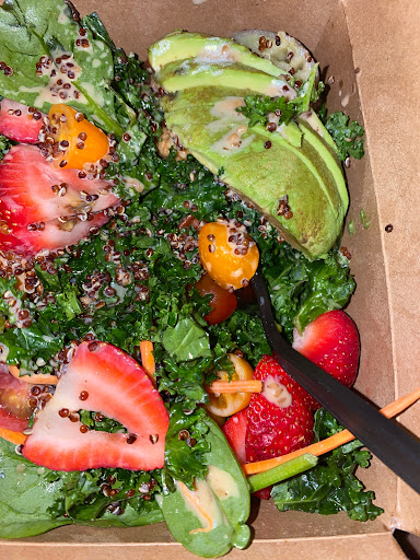 The Buddha Bowl is a colorful mix that hits all the right notes. It usually comes packed with kale, spinach, sweet potato, avocado, carrots, cherry tomatoes, quinoa, and fresh strawberries, and everything is tossed together with this delicious house-made sauce that I can never get enough of. The sauce is creamy, tangy, and has just the right amount of flavor to coat the ingredients without overpowering them. One container isn’t nearly enough for a bowl this size, so I always ask for extra, and they’re kind enough to give it to me with no extra charge. That’s huge, because the sauce really ties everything together and makes every bite hit.