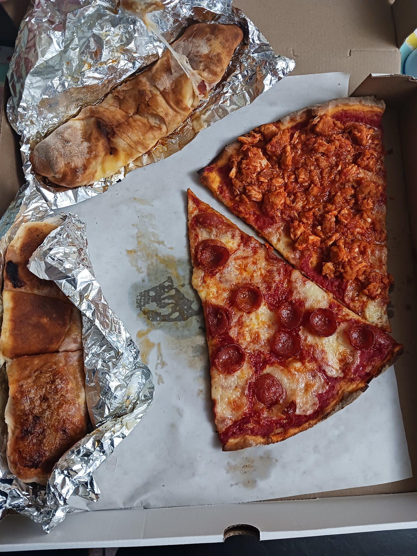 I was immediately not impressed with what I got. The buffalo chicken role, or just chicken role based on the person I called to make the order was abysmal. I was struggling to eat it as it tasted that bad. The buffalo chicken slice was serviceable but definitely on the lower end of buffalo slices that I had. The pepperoni slice was mediocre and certainly didn't look fresh. It was just about as thin as I remembered it. As for the pepperoni roll, it was actually pretty good, better than I expected. I would say it was either average or slightly above average.