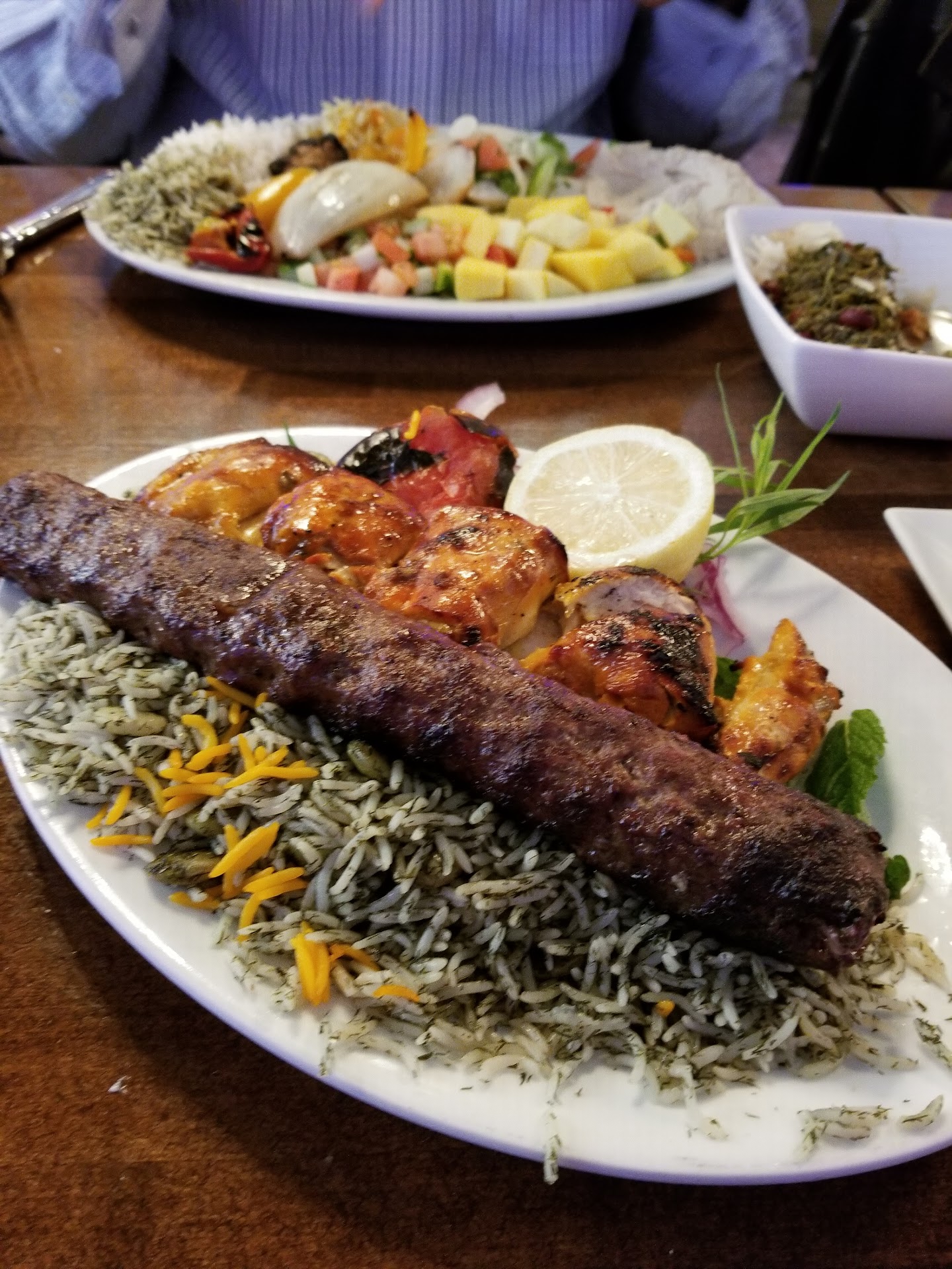 For the main course: chelo kebab koobideh, barg, chengeh, boneless joujeh and kebab chelo. The beef should have been cooked medium rare, it came out well. It was kind of chewy. The chicken breast was dry and the flavors didn't really penetrate through into the meat as expected. The ground beef was more flavorful but that's inherent. They also served us three different types of rice (white, "green rice" with lots of herbs, and a "yellow/orange" rice with orange peels in it I think). I actually liked the "yellow/orange" rice. The "green rice" took some time to get used to because it was heavily seasoned with herbs.