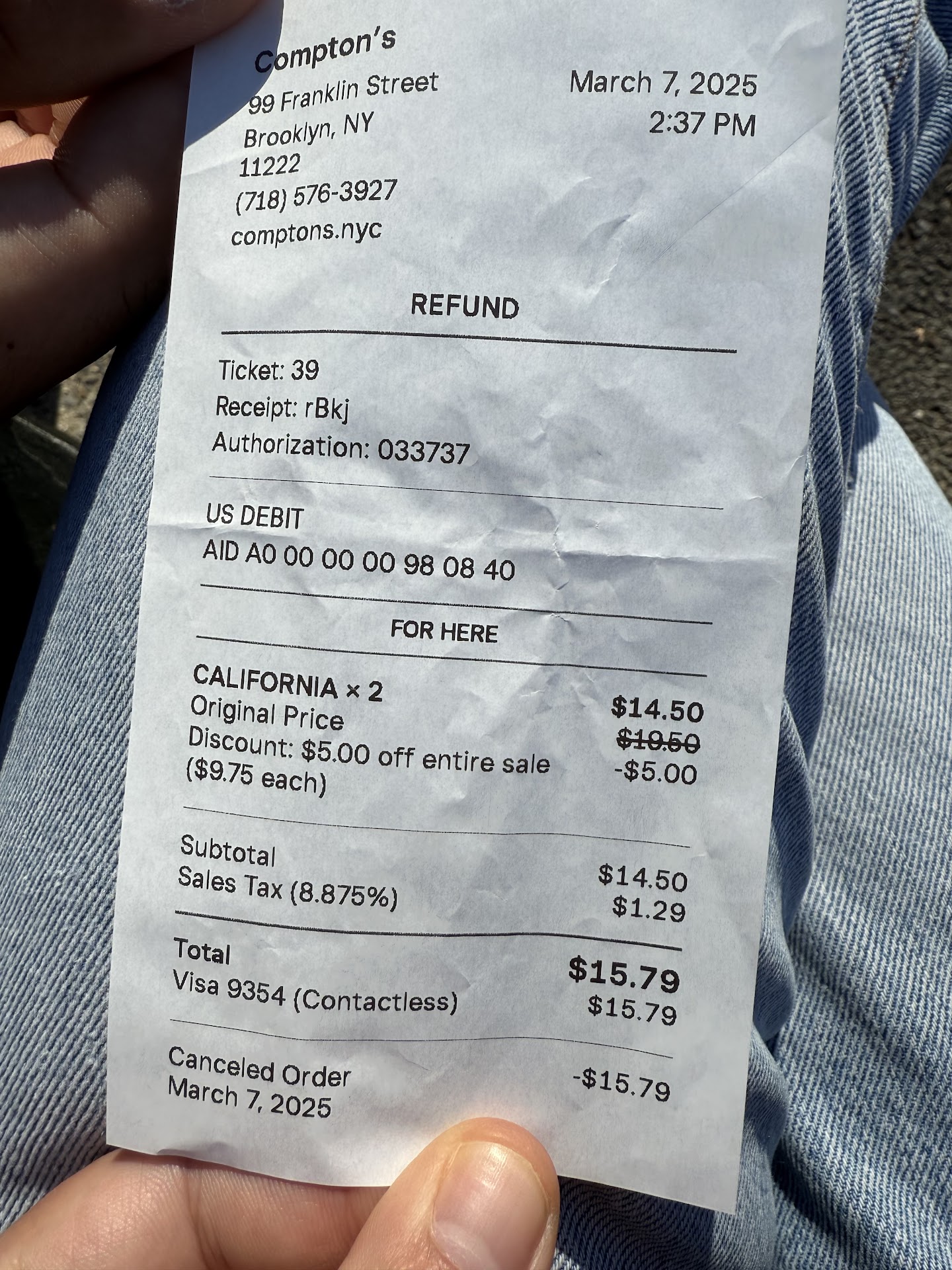 I decided to stop by the Greenpoint location since I was in the area, and for sure I will never return to this location. I order from the Astoria location multiple times a week, so I know exactly what I like and the service is always amazing and warm. When I went to order, the girl with dark hair and I believe a septum piercing had the worst attitude. She was rude and she literally made me and my husband wait for over 20 minutes. I know this for a fact because there were guests that came in and ordered while we were sitting there waiting for our order, and they were getting their orders in less than 5 minutes. As I said before, I frequent the Astoria location weekly and I’ve never waited more than 10 minutes for multiple sandwiches. To add to that, I have proof because our order # was 39 and she was calling out, 38, (skipped 39), 40, 41, 42, 43. That’s when my husband went to cancel the order and simply said that making us wait was wrong and that he would like to cancel our order. She gave him attitude and then said she would cancel the order and refund us. When he said thank you, just know that’s not nice and she sarcastically mocked him by saying “what’s not nice? Me giving you a refund?” as she rolled her eyes. Also when I had paid I had the option to redeem $5 dollars due to me having so many points for being a loyal customer, which now I will not get back so technically I am losing money, and I’m not even sure I will get my refund period. Lastly, she clearly tipped herself when after I pair because my account was charged $21.23 and the “refund” was $15.79, which I am adding a picture of both the “refund” and also what my account was charged. Both have time stamps. I would please like a resolution to this because this is not right and I don’t appreciate being treated unfairly and taken advantage of when I am, and will continue to be a loyal customer (just not this location).