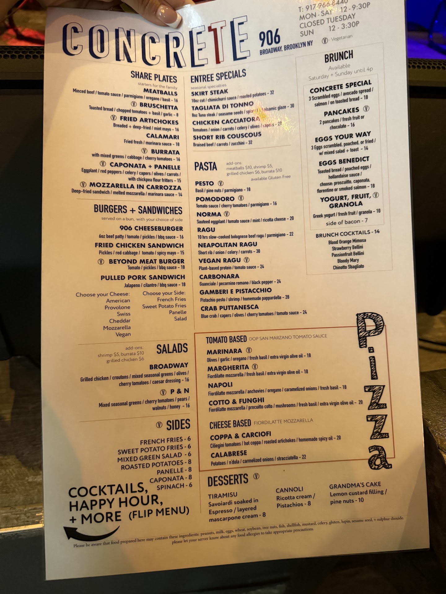 Read moreI moved into the area in early 2021. It’s now 2023 and Concrete has been and remains my favorite restaurant in the city. Yes, the city. I’ve ate all over the city. I’ve managed to get reservations into otherwise impossible places. Nothing tops Concrete to me. To start, you must get to know the crew who runs it. They are hospitable, caring, and have really went above and beyond for me several times. Everything is made with love and it’s not hard to tell. I take friends here regularly and I especially take anyone visiting the city. There’s options for most any diet restrictions I could think of. The pasta is phenomenal, the burgers are phenomenal (their beyond burger is my favorite I’ve ever had), the fries are superior to anywhere. If you get the fries, ask for a side of their honey mustard, you’ll be asking for another side of it soon enough. Grab a cocktail if that’s your sort of thing also. On weekends for brunch, I’d suggest the blood orange mimosa! Don’t let the area confuse you, this place is top notch. It’s been my best kept secret but I guess it’s time I share with the rest of the world. 10/10 worth the travel to try this place out. Oh, and the ambiance of the place is so relaxed but chic. Ask about their jazz nights that are coming soon also....