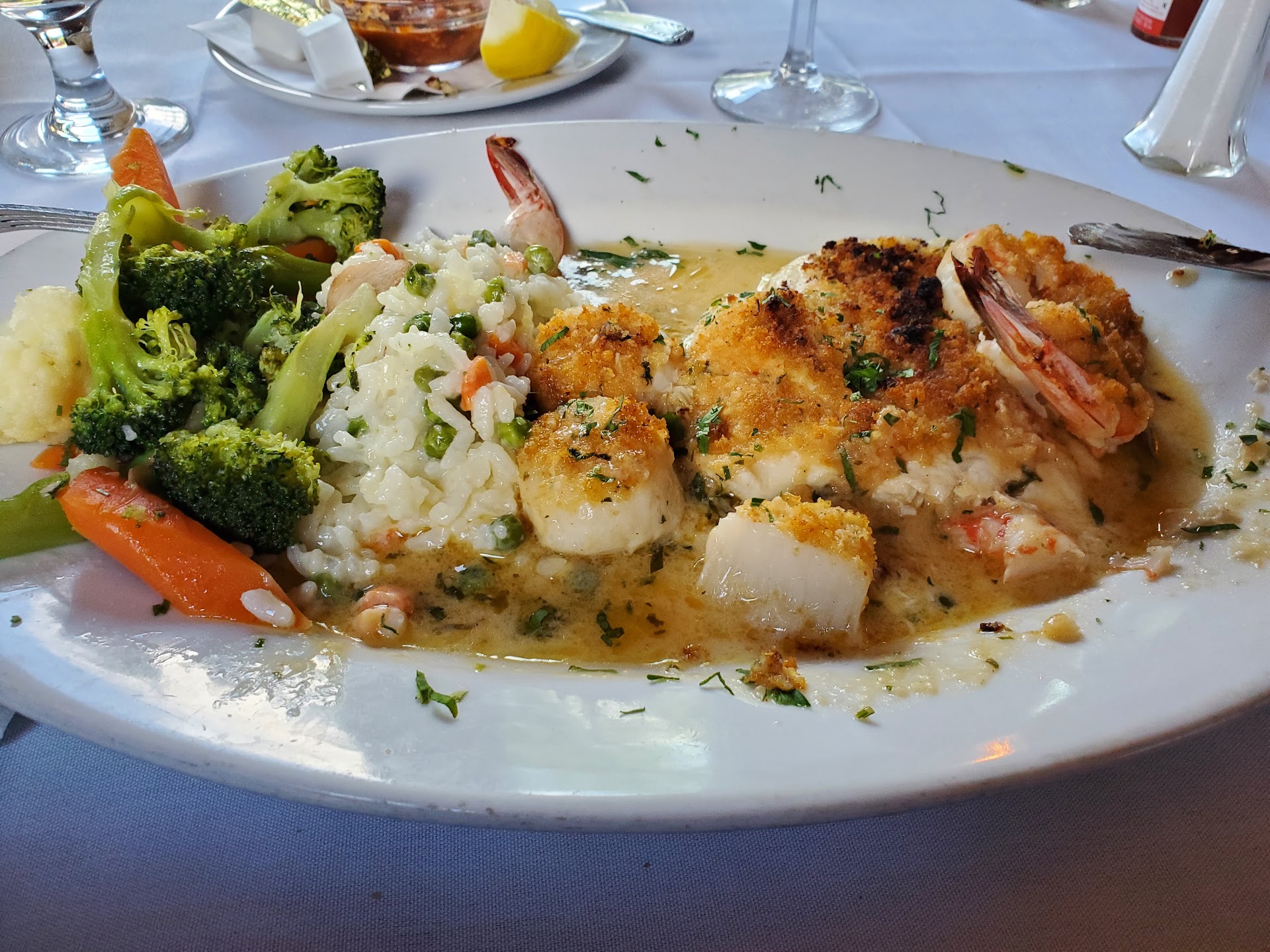 Worse dining experience we ever had. Outside dining was dark. Inside dining was extremely noisy. They need acoustics treatments inside. Owners Might need to have their hearing checked. My ears we ringing for hours. Waiter could not hear our order, and you could not have a conversation with people at your table. Service was terrible. Waited 20 minutes for our drink order to be taken. Another 15 minutes to get our drinks. Ordered fried calamari and raw clams. They brought the calamari but no clams. Calamari was tough, not good. After another 15 minutes they brought us an order of baked clams. We refused the order and told them we ordered raw clams. Another 15 minutes pass, and they bring us an order of raw oysters. It was laughable. Another 15 minutes and we finally got our raw clams. But they were fishy and did not taste fresh. Another 20 minutes and we got our dinner. Wife ordered rack of lamb, medium well. Four pieces were cooked properly two were very rare. The dinner also came with risotto. There was about a tablespoon of risotto and some vegetables which were too hard to eat and had zero seasoning on them I ordered king crab legs. Got four pieces of crab, which were about the size of my finger. Total amount of meat on them was about ¼ cup – for $47. I also received a tablespoon of risotto and raw vegetables. When we complained about the crabs the owner told us that crabs were expensive, so that is why the portions were so small. To give us a larger portion they would have to charge more. Not an acceptable answer. They could have said Market Price and not insulted us with the order they served. At that point we left and went elsewhere for dessert. I can assure you that we will never go back...