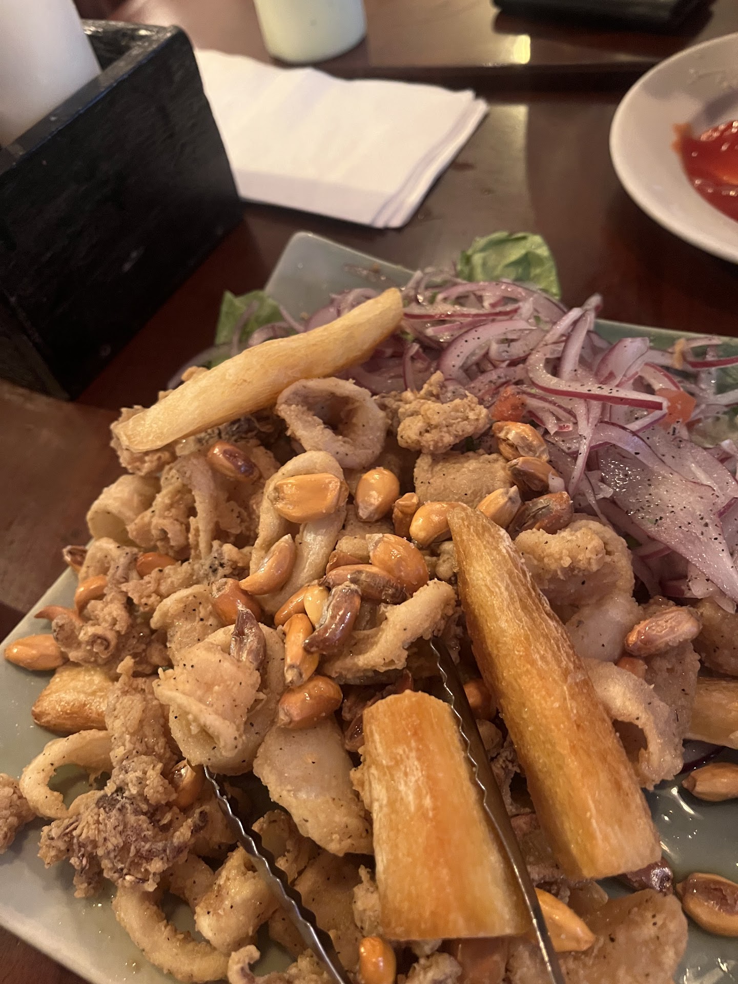 Needs work on the SERVICE . I went and ordered Papa a la Huancaina , Jalea , and Chicken Broth Soup. I came with 2 other people. The waitress comes and serves my two friends water and I received no water or any utensils ( my friends did) . So I waited , after 10 minutes I had to ask the owner. ( The owner always sticks around ). I won’t lie , Food is delicious but, the way they served it needs work. ( For those true Jalea fans , always check the food beforehand). ( Vegans out there , check your lettuce and veggies beforehand) . I had a little dilemma with the food but gladly , the owner came and talked to us and helped us resolve the situation. **{ To The owner, Money was not the problem but your presentation on how your food was served was not right. By the way this was His Comment when I addressed the food issue ••” OH THAT HAPPENS ONCE OR TWICE A YEAR BUT ITS NOTHING “•• So Your Telling Me Because I’m Not A Food Inspector or Someone Special, That I Shouldn’t Receive Well Prepared Food ?