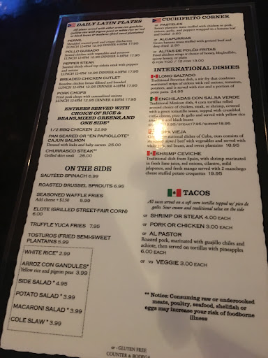 So let me tell you about my horrible experience at this place first we didnât have reservations we were walk ins me and my family total of 5 of us including my 7 year old daughter were seated waitress came gave her name and gave us the menu and gave us a few minutes to look over the menu so letâs start with drinks I order water at first and I believe some of the family order sodas cool she comes back and I try to order a blue Hawaiian she tells me sorry we are out of that drink oh ok cool she suggested something different I wasnât interested so I said never mind thank you, then we order our food 2 of us had churrasco with white rice and beans , and 2 of us Bistec Saltado with white rice and beans and extra white rice and guacamole with chips ok so as we waited and waited and waited I called the waitress over and ask why is the guacamole taking so long she says they ran out of avocado and had to go get some more I believe in their stock room I guess finally they bring out the guacamole so we just talking laughing killing time this food took forever to come out there was a young man by the name Bryan or Brian he was trying his very best and was very attentive he keep apologizing I said itâs ok I though maybe they short staff fine whatever they didnât bring out the white rice for my daughter and the didnât bring out my beans so Brian came over asked if everything was alright I said no Iâm missing white rice and my beans and we sit there with whatever food they did bring out I start giving food to my daughter sheâs hungry waitress never came back not even to check on us and to see if everything was good until my aunt called her over I told her we missing a white rice and my beans so I continue to feed my daughter and I also now take a few bites out of my plate so like about 10 minutes later they come and tell me there is no more white rice I was like WHAT?! So as a mother my daughter eats only white rice I give her my rice and I asked what other do you have they said I think Moro de guadules I didnât want that so I told them I didnât even want my pepper steak the young me came back to me and stated that I had already ate some food from my plate I get it but you also donât have any more white rice which I should have been advise of way before my food came out then he was really nice in trying to accommodate me and so I ordered a Cuban sandwich I though I regular sandwich when the brang the the sandwich I bit it all I tasted was mustard so unfortunately I told the guy I couldnât eat that cause I donât eat mustard I told him you know what just can I have the bill Iâm not even hungry anymore then after me explaining to him everything that was wrong I ask to speak with a manager and he was hesitant then Iâm like oh god then I seen a lady by the register looking at me trying to tell him everything that was wrong and I say she can come hear this too so she came to the table I ask who she was she said her name was Julianna and I asked her position and she told me she was manager for the day interesting and I explained now everything that was wrong to her also adding money has never been an issue and I go out to eat a lot I never went threw something like this she was really nice apologized and all overall I wouldnât recommend this place to my friends or family it was a horrible First impression best of luck to anyone that...