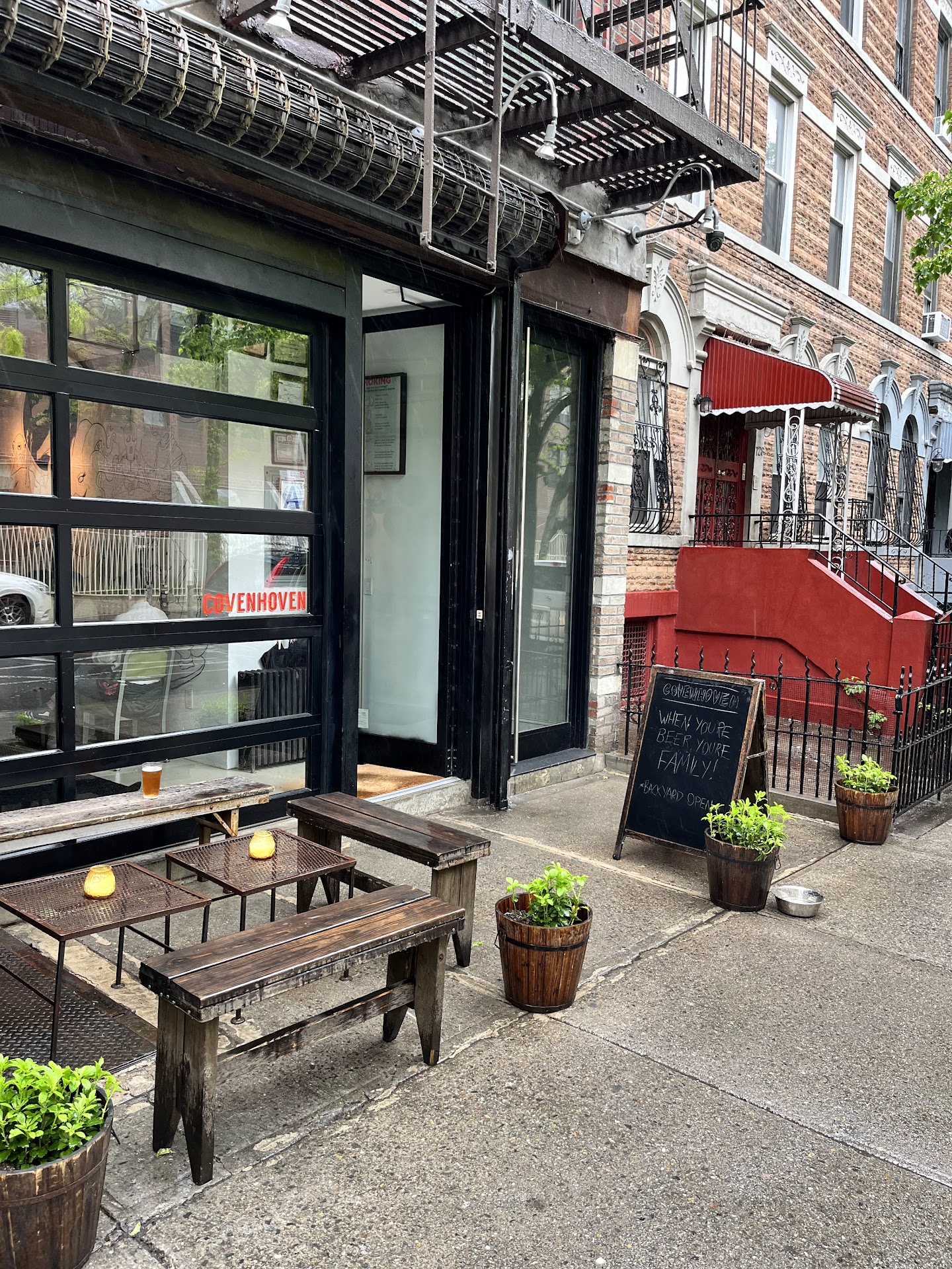 One of the best beer bars in Brooklynâ. It's cozy inside, but they have a nice backyard with a patio, planters and grass with tables. There is a small front porch with a couple of benches as well and people bring their dogs and have a beer out front.