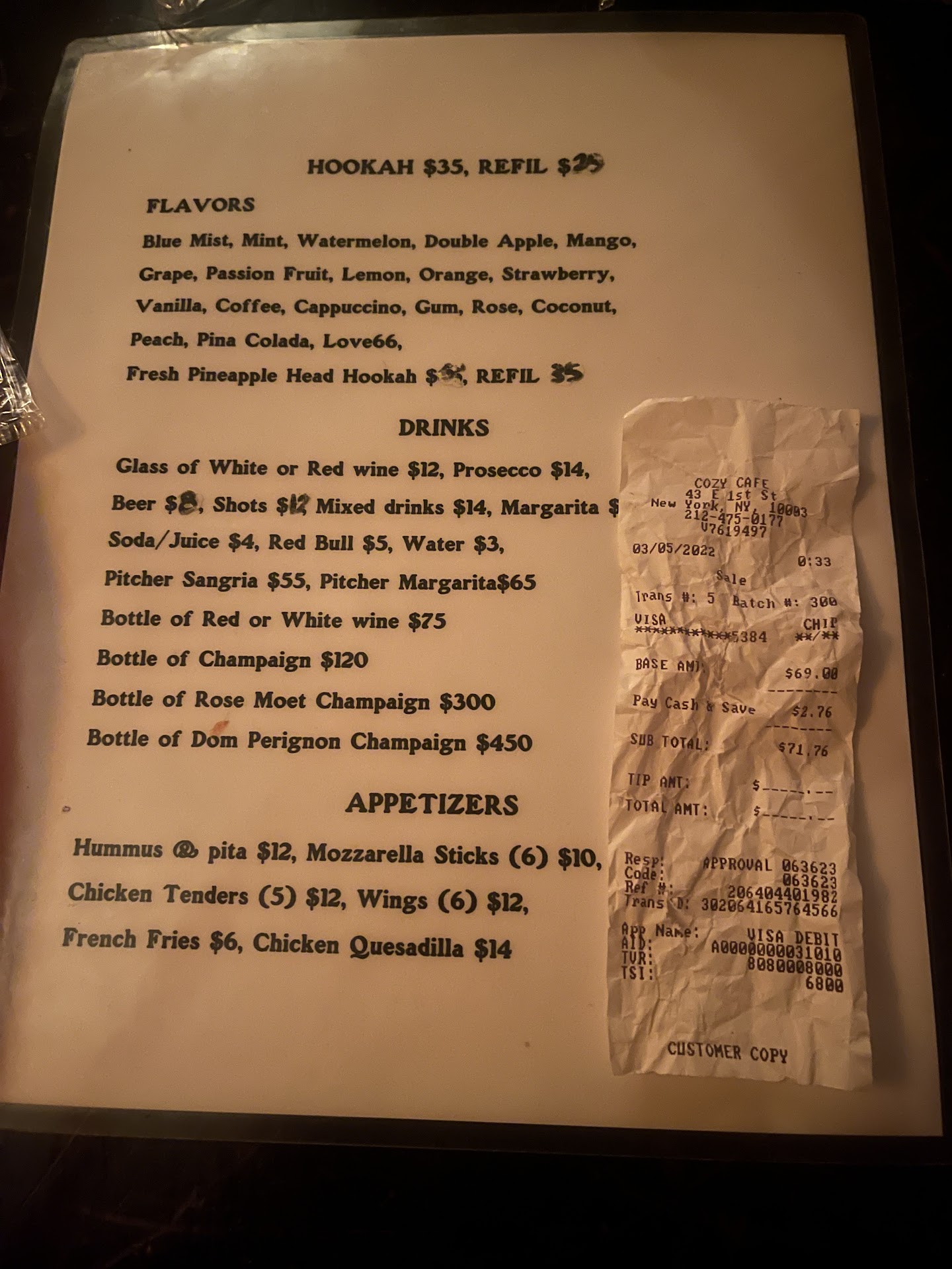 Read moreSo I was charged $71.79 for a strawberry hookah ($35) a margarita ($15) and a can coke (4) which equals $54 with Tax $58. When I mention it to the hostess she took my receipt ran to the back and came back with a handwritten itemized receipt where she charged me $40 for the hookah $5 dollars for the can coke and $17 for the margarita where she said the extra two dollars was tax then another tax charge of $4 and a service fee of $8 when I told her that didn’t make sense she then ran back to the back and came back with another handwritten itemized receipt. This itemized receipt stated that the same she priced me then added $5 in tax and a new service charge fee of $10, not to mention we had to walk to the bar ourselves to order everything. After that I was never given my receipt back I had to ask for it back which was crumbled and thrown in the trash as you can see in the pictures. When I originally ordered, I only wanted hookah and I felt a little forced into buying the drinks. Also the customers next to me was over charged and we conversed with them and they told us they were charged $220 for two hookahs and 5 drinks. My friend was denied water to end off the experience. This was by far an horrible experience overcharged and changed receipts in front of my eyes. Throwing my...