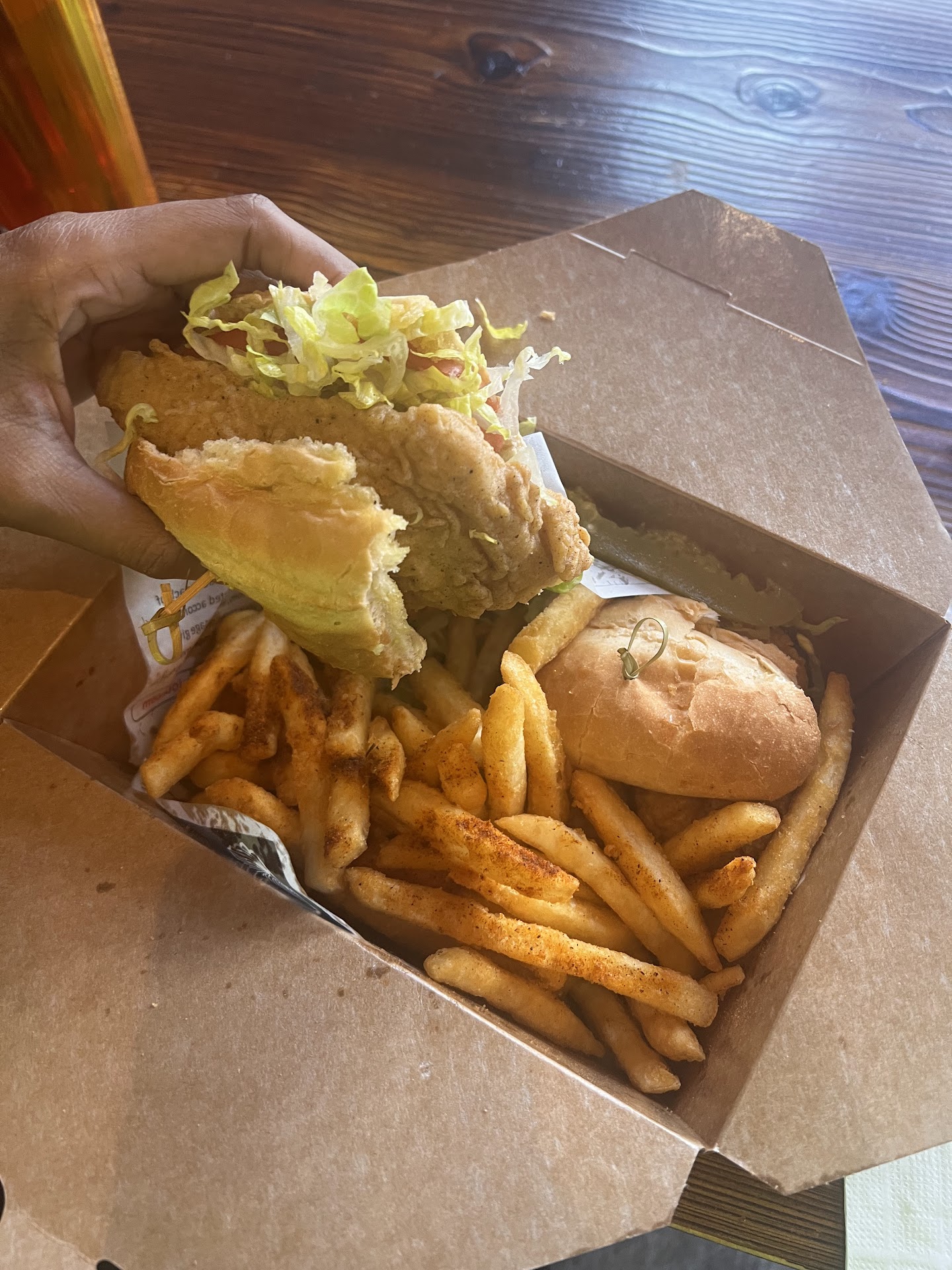 I ordered the fish and shrimp basket with Cajun fries. The batter tasted like a light version of Popeyes. Delicious.