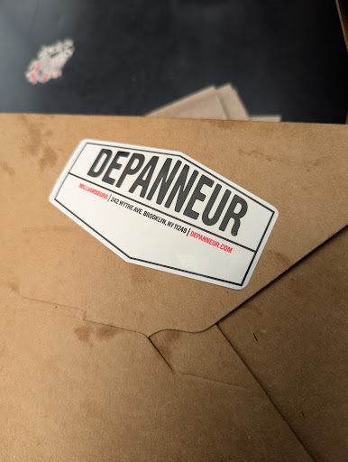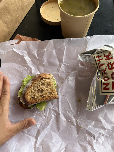 When I opened the sandwich (with the packaging making the sandwich look larger than it actually was) I was shocked to see how small it was. You can see the sandwich next to my hand for scale. It’s like they took the smallest pieces from the end of a loaf, and cut that in half. I understand the rent can’t be cheap for this business, but this was pretty disappointing. Ive adjusted to Williamsburg prices and know what to expect, but this is the only time I felt truly ripped off. The chicken salad was great, but I felt like I could get a better bang for my buck at literally and other cafe, bodega, sandwich shop in the area with similar quality. I finished the sandwich in literally 4 bites. The soup I had was a vegetable medley with pasta shells, it was OK! The utensils it came with were eco friendly but the spoon was flat lol