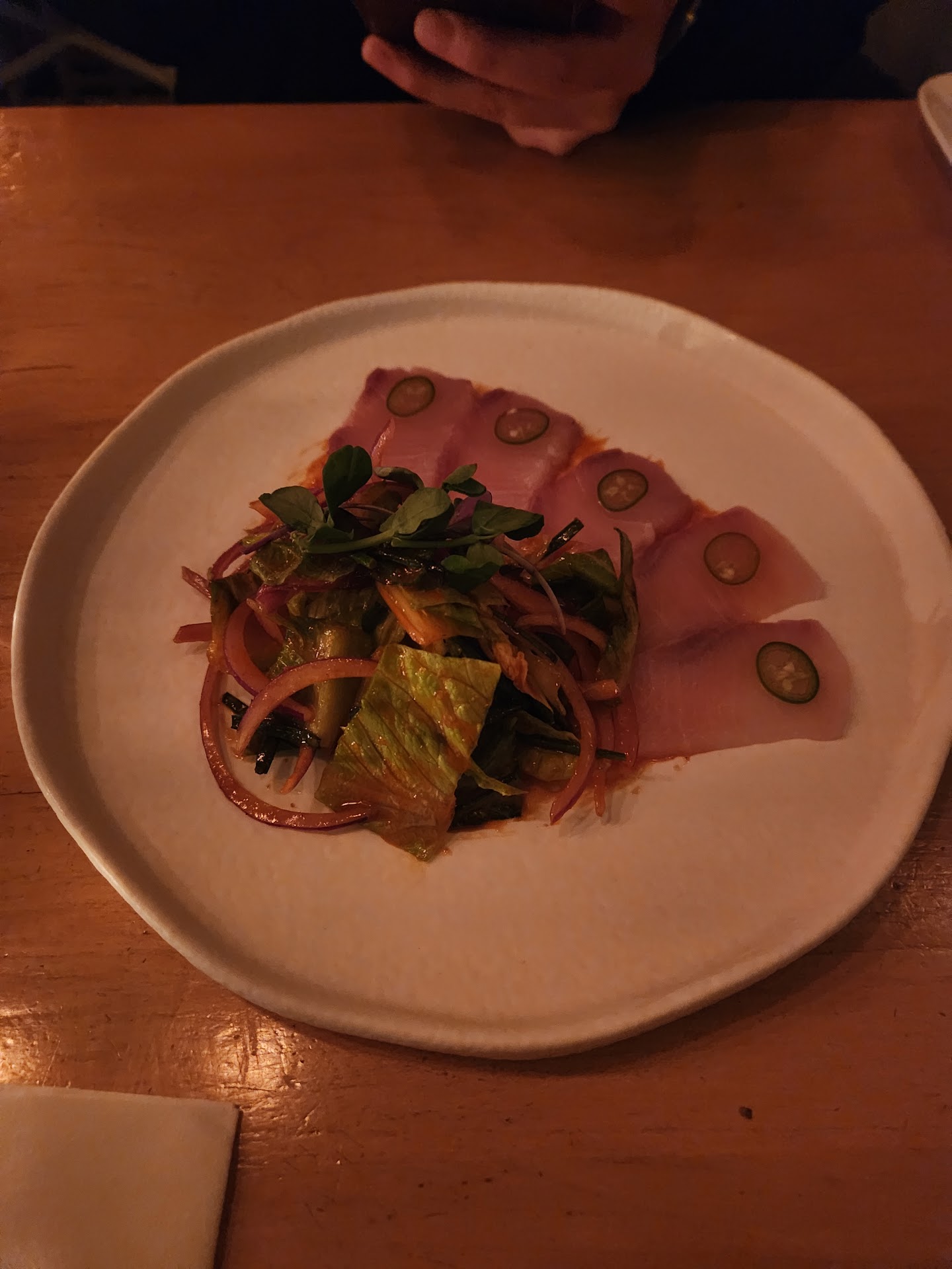 1st dish: Yellow Tail with Salad. We're great fans of Yellow Tail back in Korea. We wanted it so bad every winter. Finally we have it here. The fish were so soft, and red sauce (sour & spicy) was AWESOME.