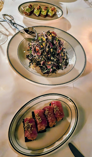 We started with both salads, the deviled eggs, and the spicy tuna and smoked salmon over rice. Each dish was fresh and full of flavor, with the smoked salmon standing out as my favorite bite of the night.