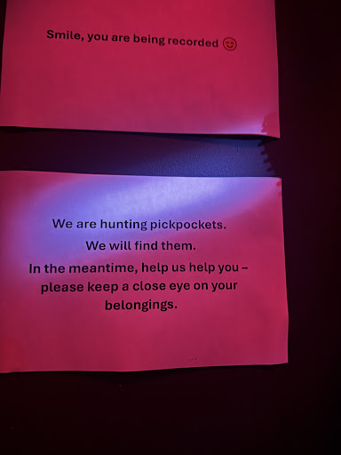 Suspiciously, one of the doormen literally tells you to keep you phone put away while inside “for the vibes” (easy targets) — something I have never heard anyone announce to patrons as they enter and which specifically contradictions the sign they have up inside telling people to keep close hold on their belongings. He might be in on it too. Or whoever told him to give that announcement.