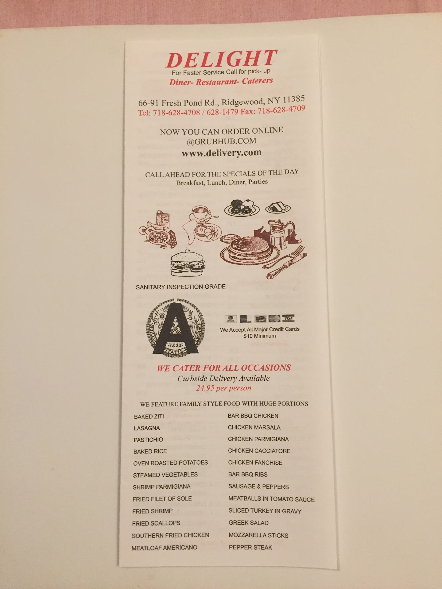 This whole experience was very uninspired and a big deterrent from wanting to revisit this place again in the near (or distant) future. The waitress who served us was just as uninspired and blase as my panini was tonight. If I had to grade her effort, I'd give her a C. All in all, going forward, "Delight Diner" is more like "Forgettable Diner." Cannot heartily recommend - I'm sure you can and will find better restaurants and eateries within a 0.01 radius of this place. Stretch your legs a little farther and head to any of those other places instead of wasting your hard-earned dollars at...
