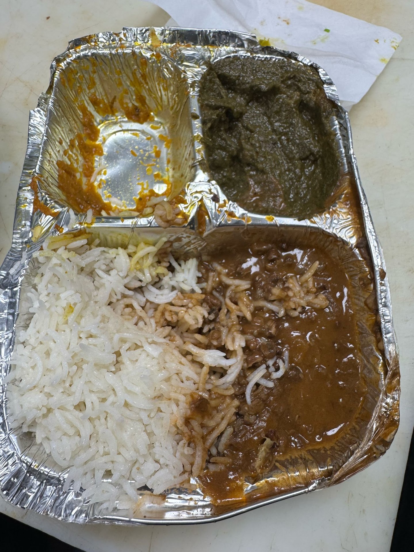 The man who had given me the samples behind the counter served me my naan. He came back 3 or 4 more times to check up on me and noted a spill on my shirt. When he asked how my food was instead of saying subpar at best I said "it's a lot" to which he implied that I was a large person for whom these gigantic portions were manageable: "you're not a small baby."