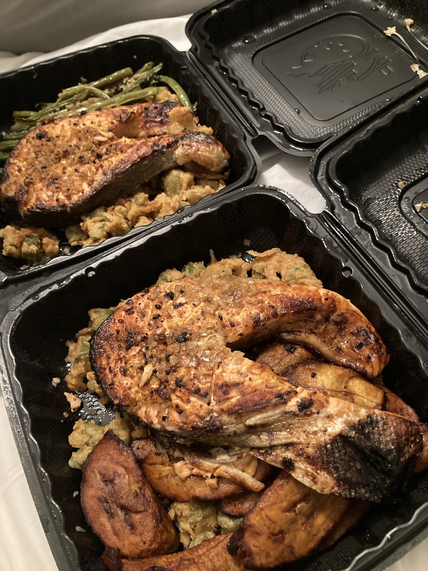 Let me just say that this is the BEST fish plate Iāve had in the city. Bar none. Iāve lived in NYC for nearly 15 years, and Devinās Fish and Chips did not disappoint. Somehow, the food travelled so well, and my apartment is not close by. I ordered the salmon steak, fried okra, and sweet plantains. WOW. First of all, the portions were generous. Secondly, the salmon was cooked to perfection! Not overcooked, and it had the perfect amount of fat. The char on the salmon skin and the seasoning? FLAWLESS. My husband hates salmon skin, and this was the first time he didnāt share it and ate it himself! The bit of lemon on the salmon was perfect as well.