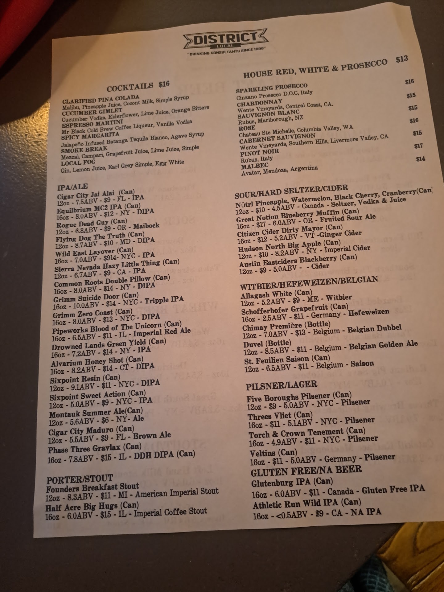 The cons: My boyfriend and I were served by a rather innattentive server who seemed to forget about us more than once. When I ordered a vodka cranberry, they returned with a vodka soda. A small mistake, to be sure, but at this point, the bar was neither crowded nor particularly noisy. I felt we weren't being listened to very closely. District Local's speciality drinks were also a huge miss. Both the Cranberry Mule and the West Side Chandy tasted awful. The vodka soda I mentioned might have been made with dishwater. Eventually, we migrated to their canned beer selection, which was, predictably, more palatable.