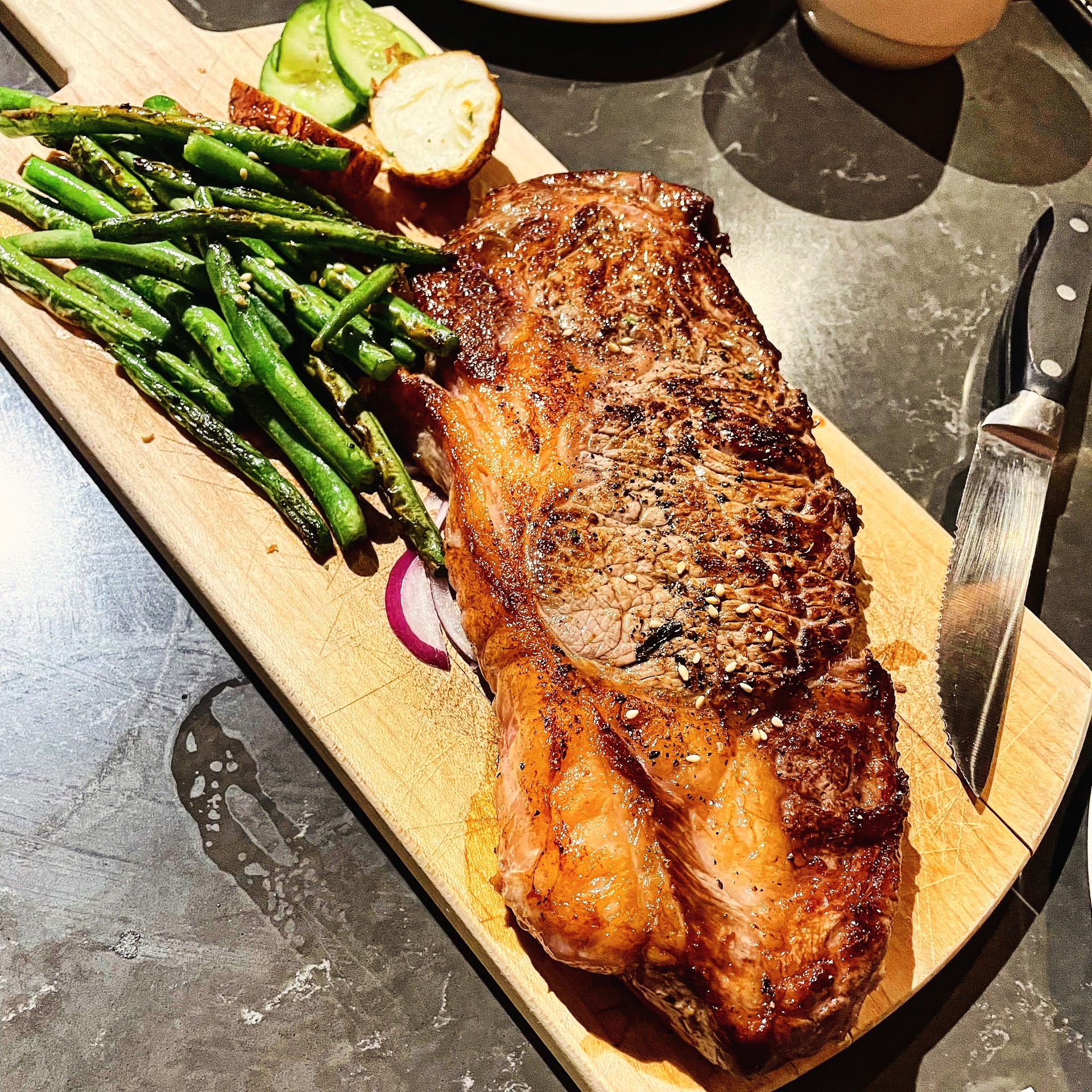 Food was excellent, except they can use more people for service. They're nice enough but seems short staffed. We walked in and waited a bit for someone to acknowledge us, no one did, so we just took a seat at an empty table. The table still needed a wipe down. A young guy came with 1 menu for the 2 of us and wiped the table, we consented to it. He returned later with our waters. It took at least another 15 minutes till he came back to take our order. The table with the family who came in later than us got their order in first eith another server Angela. I was pregnant but I guess the other server Angela didnt see that. It was my friend's birthday, she wanted to try the filet mignon, but was told they ran out, she got the rib eye. She liked it and it looked presentable and cooked the way she liked it. I got the linguine with white sauce and scallops, it looked great and the amount of sauce was just right. They had some clam pieces in there too, which was a plus. and We shared a salad, relatively good sized, wished they have more variety of veggies in there besides just a few pieces of grape tomatoes and some cucumbers for a $10 dish. We asked for more dressing, which was some Sesame soy type. It was alright. My friend wanted a drink but there was no bartender the night before the 4th of July on duty. So the bar was closed, but beer is available. But my friend was more interested in a cocktail so we passed on that. When it came to dessert, they only had 1 choice since I guess it was almost time for closing. We got tiramisu. It still had frozen layer on top. Great food, great atmosphere, can definitely use more help. By the time we finished dinner it was around 10pm. Our waiter waited in front of me till signed my receipt with the tips. When we left, the place was empty, not even a...