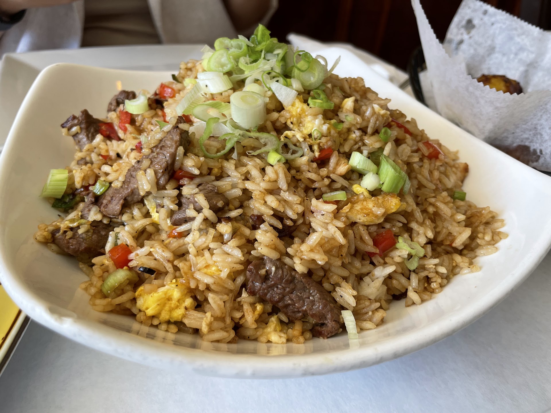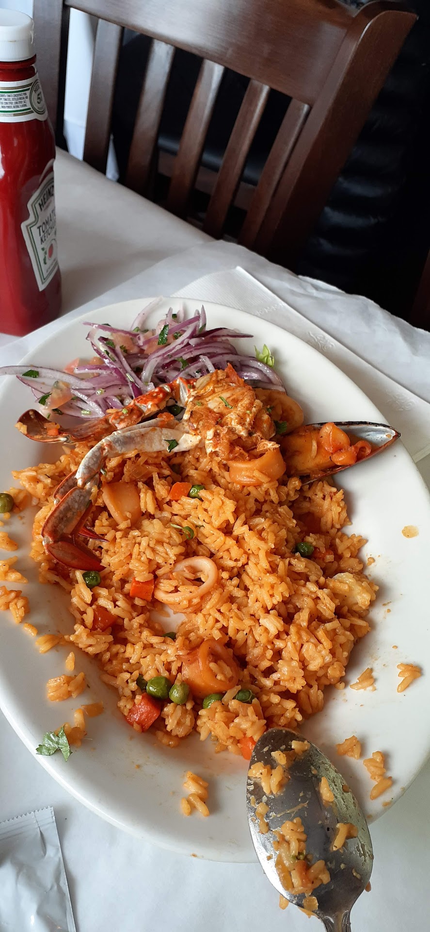 I found this gem accidentally and I was grateful for finding it. I eat Spanish cuisine on an almost daily basis but I never had Peruvian cuisine. The menu had some familiar dishes, so I was conservative in my order. I ordered arroz con mariscos y tostones (rice with seafood and fried green plantains).