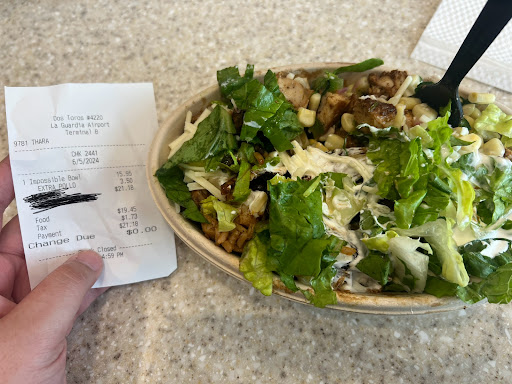 Read moreHad a bowl here from Dos toros before leaving on my flight on Labor Day weekend, I got to say, it's just like chipotle, but the employees are incredibly rude. They quite literally skip over some of the vegetables and options and go straight to the sauce, and when we ask for the corn and onions, the employee gets frustrated at us for ignoring her about the sauce. First of all, you ignored us about all the other options. They really just want to go as fast as possible and make it as least worth as possible by skipping out on all the things you can get. Basically, they only ask for sauce and meat and rice. If you want vegetables, sour cream, other stuff what not you have to literally ask them to stop and do it and they seem so frustrated. Well at least one of the employees, some of the other ones are fine. Overall, the food was ok for before a flight, and a typical chipotle bowl that tastes pretty decent as a more American style dish. The leafy vegetables (lettuce) however are old, brown, and wilting but the meat and everything else is good. Food is ok, employee service needs work. Plus, it was kind of overpriced for the food, 11-15 dollars vs the...