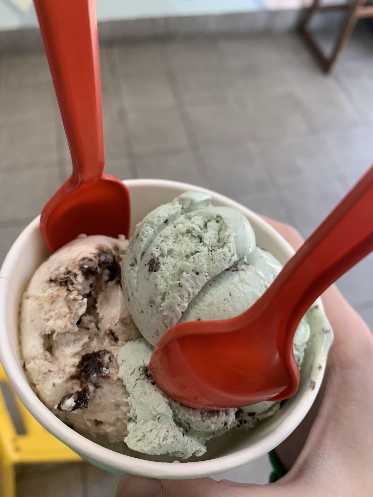 The chocolate reminds me of U-Bets. The coffee is “light and sweet.” The mint chip leans more peppermint than spearmint.