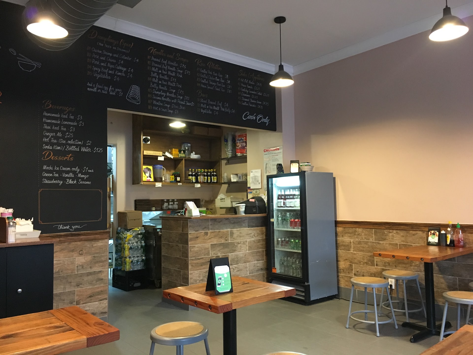 Limited seating indoors - Sometimes have to take to-go because the seats are filled. Many people sitting on their phones waiting for their to-go orders. Slow service (peak times) - Waited 15 mins. for baos and dumplings once at 7pm. Cash only - tradeoff...