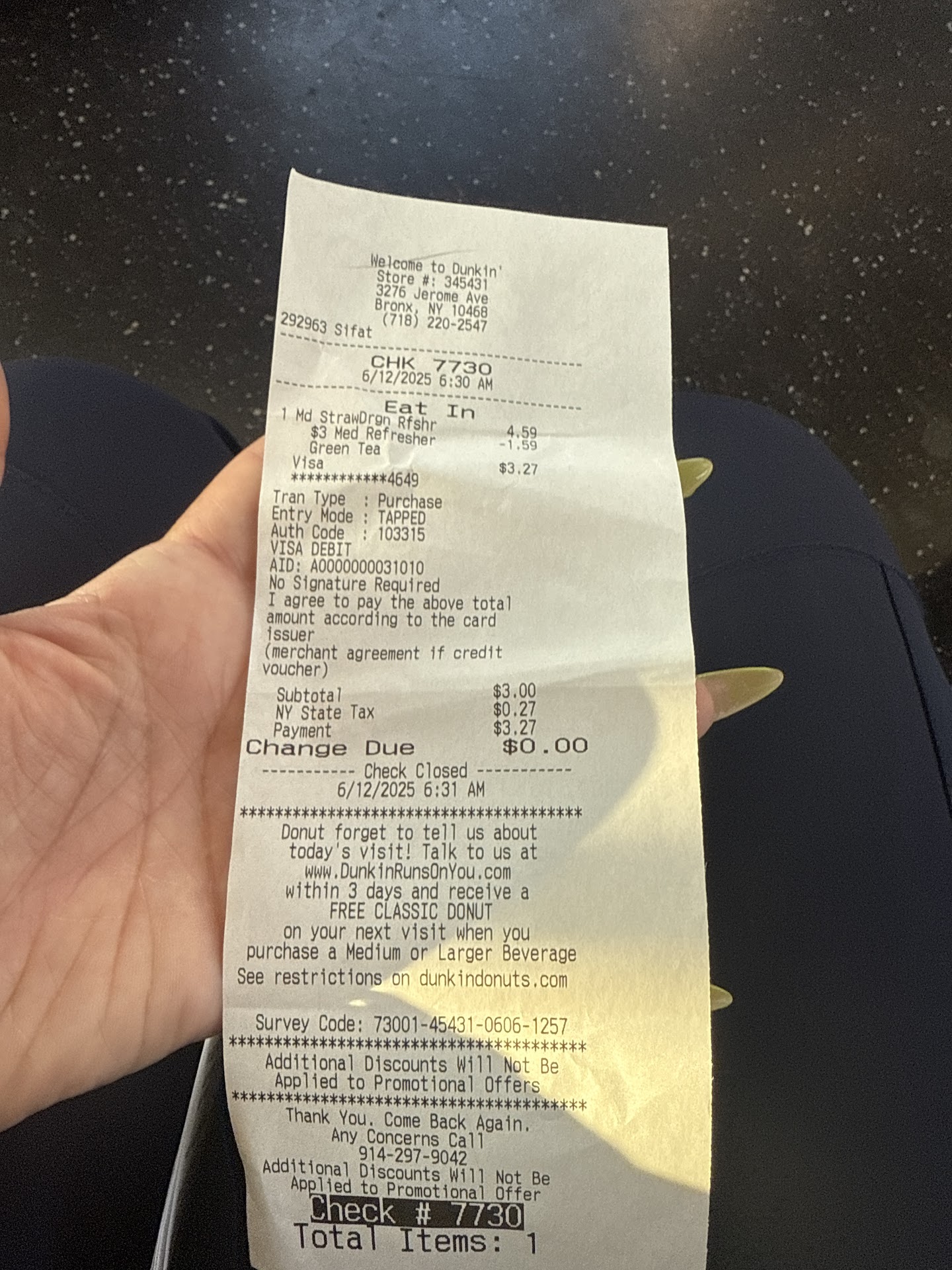 Read moreThis Dunkin Donuts is a pit stop inside the large bodegaesque gas station on the corner of Moshula Parkway and Jerome Ave. Unlike other Dunkin Donuts that are spread along America's highways this Dunkin Donuts is a sweet little store. It's within the gas station's store; if you don't look to your left when you walk in you might miss it. Grab and Go style, I stopped by for some gas and grabbed a hot chocolate at DD before I hopped on the highway for a 1 hour+ drive back to Connecticut. You can gas up and grab a sweet snack (donuts, d'oh!) or a breakfast treat like bagels or an egg sandwich. Lots if choices and the coffee is fantastic. Customer service is always very polite; will accommodate your needs and desires. It's in a great location: before you hit the heavy traffic of The Concourse or Jerome Ave or before you hop on the highway. There's a clean bathroom but it's shared by the gas station customers. Not a problem as most DD don't have bathrooms; I consider it a good thing. Not sure about wheelchair accessibility. Prices are average DD prices, a little higher than others because 1. It's NYC and this DD is strategically placed where there are no other places to get a small breakfast, donuts or hot drinks... with parking. The only thing I don't like about Dunkin Donuts... and this goes for all Dunkin Donuts.... is they never have a large enough herbal tea selection. I don't drink caffeine. I bring my own tea bags with me. Dunkin Donuts has never been able to get just the right amount of sugar and milk in my tea. Sometimes I just get a cup of hot water and do it myself. But that's a me problem not DD's problem. It's a nice little DD at...