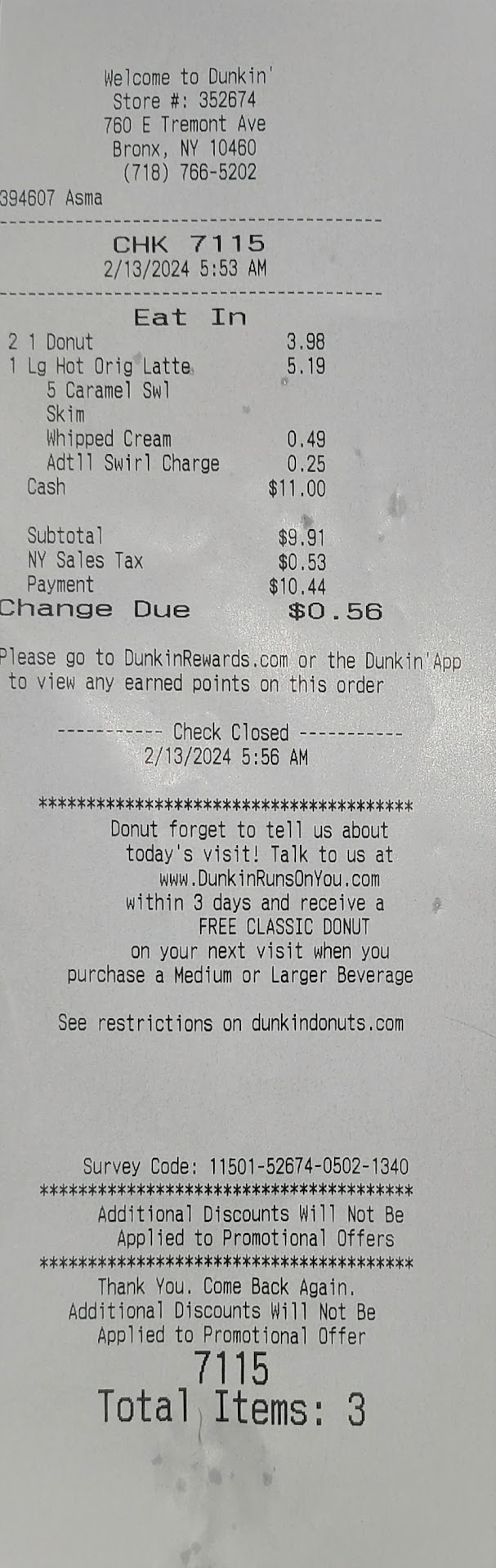 Read moreI went in and said "¡Good Morning!", Mr Leo L. looked at me and just said: "come to the other register", I said: "you don't look happy to see me"; with a bad attitude he responded: "this is my face everyday". A few minutes later they called me for my order and this girl just left it there as I was approaching her, and even though she didn't hand it to me, I said "Thank you". I didn't get a response, so I said "thank you" again, but still no response. As I was walking out, I said: "This is how you guys get bad reviews." DD at Tremont Ave (almost corner with Devoe Ave) Bronx NY. PC#352979 5/22/19, 10:46am, Order #279, Tran...