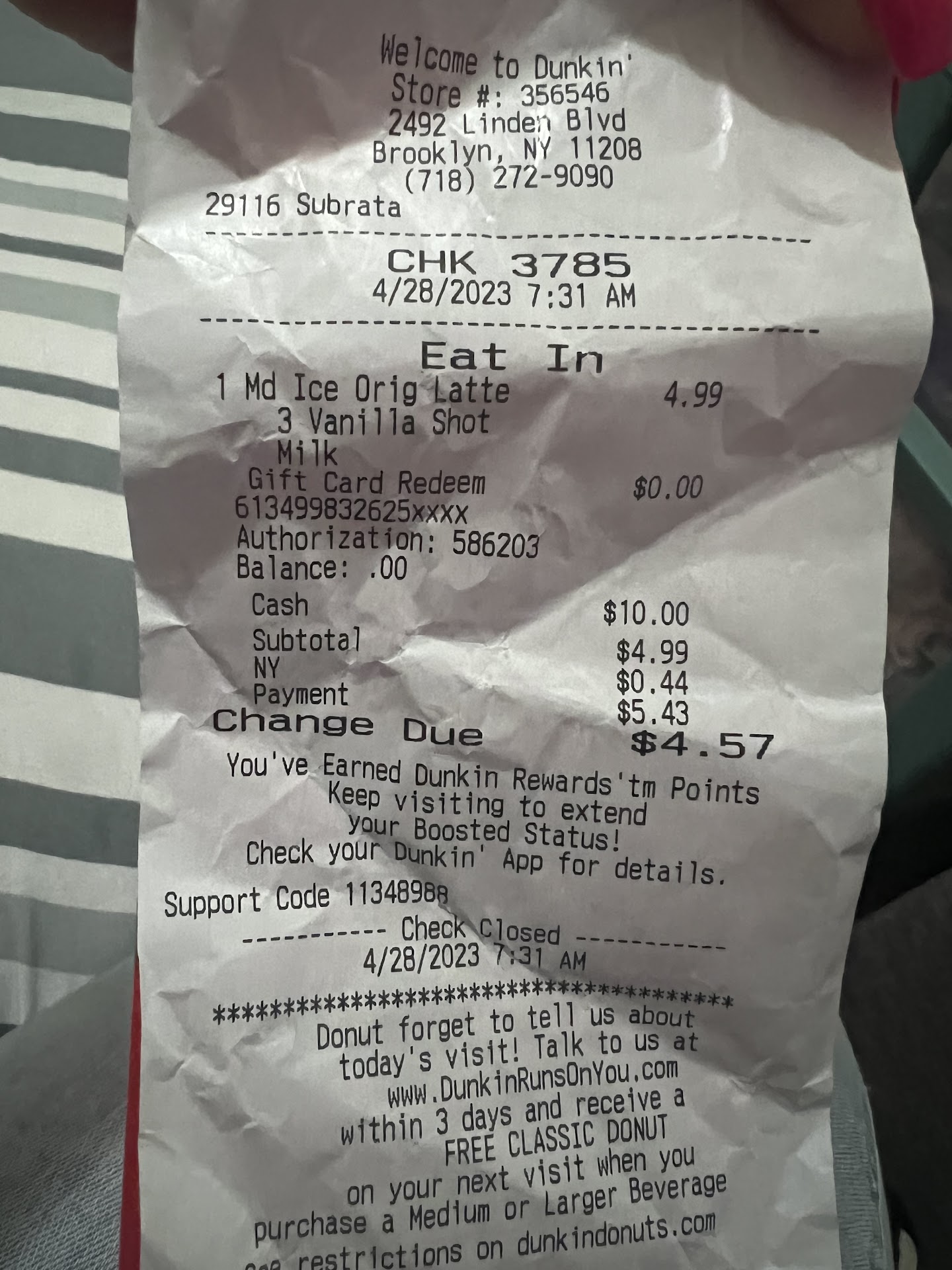 Read moreI am writing this review because yesterday, 12/24, at about 10:40 AM, I visited the Dunkin' Donuts located at 2492 Linden Boulevard, Brooklyn, NY 11208, and ordered three large drinks. I asked for no ice because I did not want to weaken the coffee with melted ice. The person taking my order told me that if I requested no ice, there would be an additional charge. I have requested no ice at other locations and have never been told there is an additional charge.