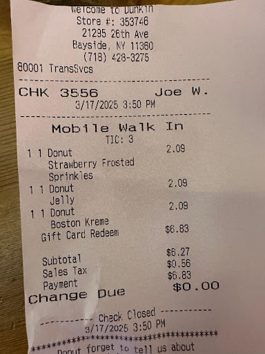 Read moreI went to the Dunkin’ at Bay Terrace today with my friend, and I got a bacon egg and cheese croissant(which was delicious I definitely recommend it), while she got a sweet black pepper bacon egg and cheese croissant. Although I ordered after her, I got my order first. We both expected her to get her order first. The people working there that day weren’t minding the fact that they had to give the person who ordered first, t get their food first. When she finally got her sandwich, it was all burnt. The egg in it was only the egg white, and it was very burnt. The photo of that sandwich on the menu showed that the cheese was clearly cheddar, but she got American cheese instead. The bacon was WAYYYYY too overcooked, but the croissant was just how it was supposed to be. Also, today, this Dunkin’ looked very gloomy, with only 3 more customers there. We’re both very upset with...