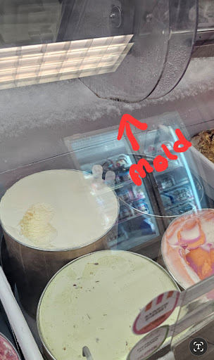 The first thing I noticed when I looked into the glass case filled with ice cream were two ice popsicles protruding from the vanilla ice cream. This prompted me to look up and see where they were coming from. I noticed that the glass case above had mold and moisture dripping onto the vanilla ice cream. I pointed it out to two employees, who told me they would inform their supervisors. One of the employees then proceeded to wipe the mold off with a paper towel and scooped ice cream only from the area where the two popsicles had formed.