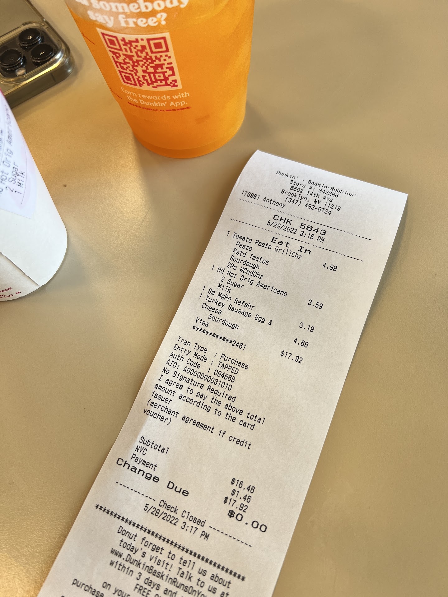 Read moreIt's not very common that I review a business like DD, however this location is an exception to it because they have outstanding service. I have breakfast here almost everyday, and have had for over 1 year now, it's on my way to the office and they already know my order which is usually medium iced latte regular milk one Splenda + egg white flatbread veggie. I don't have to say anything, they already know it.