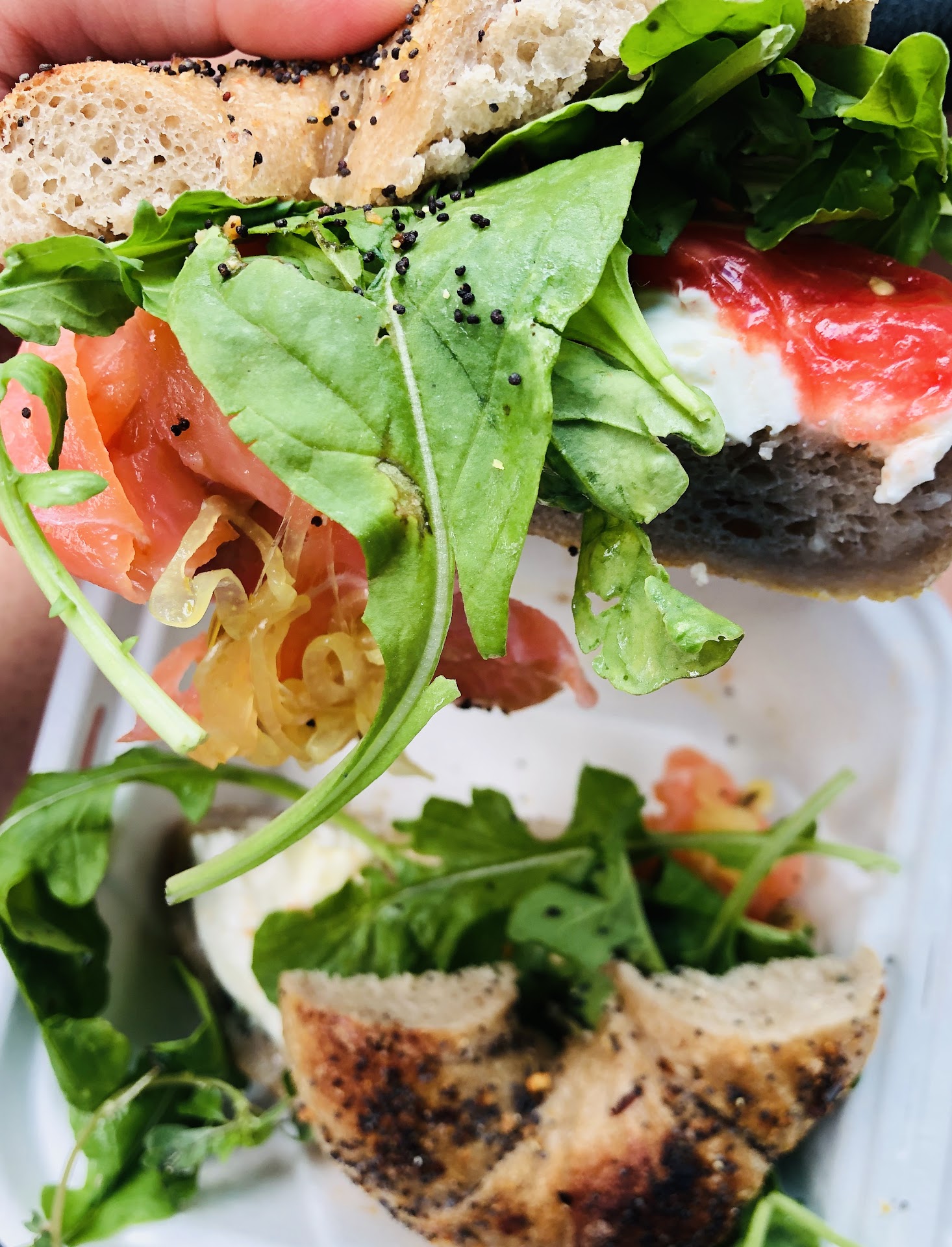 Their signature bagel sandwich is the BEC&L, which is their take on the BEC (bacon, egg and cheese) with latke (hence the “L”) on a Chicago bagel (their version of an Everything Bagel). They also have a weekly pizza bagel featuring signature Paulie Gee’s pizzas like the Hellboy. So far the best one yet has been the pizza bagel with arugula, pesto and mozzarella. They have other delicious items like the shakshuka morning bun and the Sabich and they have a refreshing nonalcoholic drink called the Passion fruit Gazoz.