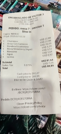 Read moreAcabo de comer allí (Northern Blv) la comida, nada mal buen sabor lunch fresco! El encebollado rico pero Frío, el mesero justifica que es frío por qué pedimos adición de camarones a nuestro encebollado igual lo mandamos a calentar. Lo que me motiva a dejar mi reseña es que en todos los precios del menú aclaran cuál es el monto en cash y en tarjeta, al momento de pedir la cuenta no te imprimen el recibo; pague en cash pero me cobran el valor como si pagara en tarjeta. Me atrevo a dejar esta reseña por qué soy dueña de negocio y se que puedo perder clientes por errores como este! Sé de antemano que el cash discount queda para el cajero y/o mesero, este no se contabiliza a menos que como dueños o gerentes pasen por alto el uso del...