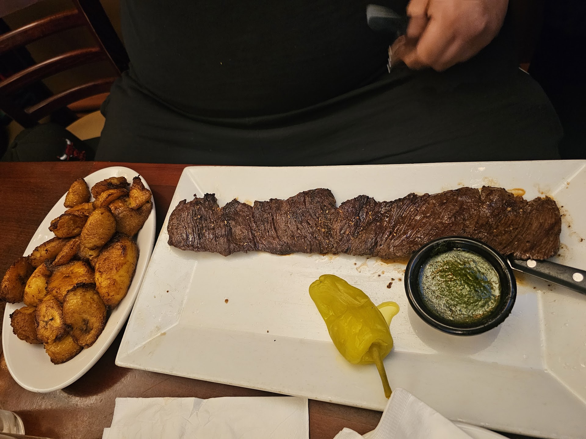 Moving on to our main entrees. We ordered breaded chicken cutlet, steak with onions, churrasco skirt steak, la paella marinera, La Placita, Chicken Fajitas, Shrimp in garlic sauce, shrimp in spicy devil sauce and a side order of tostones. For dessert, we ordered the vanilla flan and the fried ice cream.