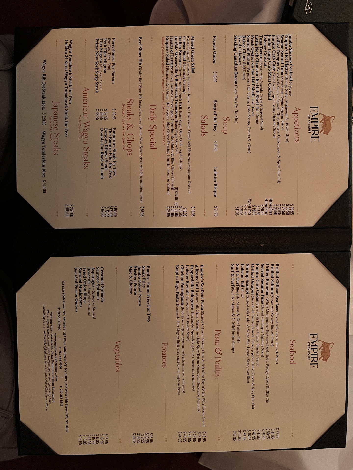 Read moreEmpire Steak House in Manhattan is an absolute gem that redefines the steakhouse experience. From the moment you walk in, you're enveloped in an atmosphere of classic elegance, with rich wood paneling, plush seating, and a warm, inviting ambiance. The service is impeccable, with staff that is both attentive and knowledgeable, ensuring that your dining experience is nothing short of exceptional.