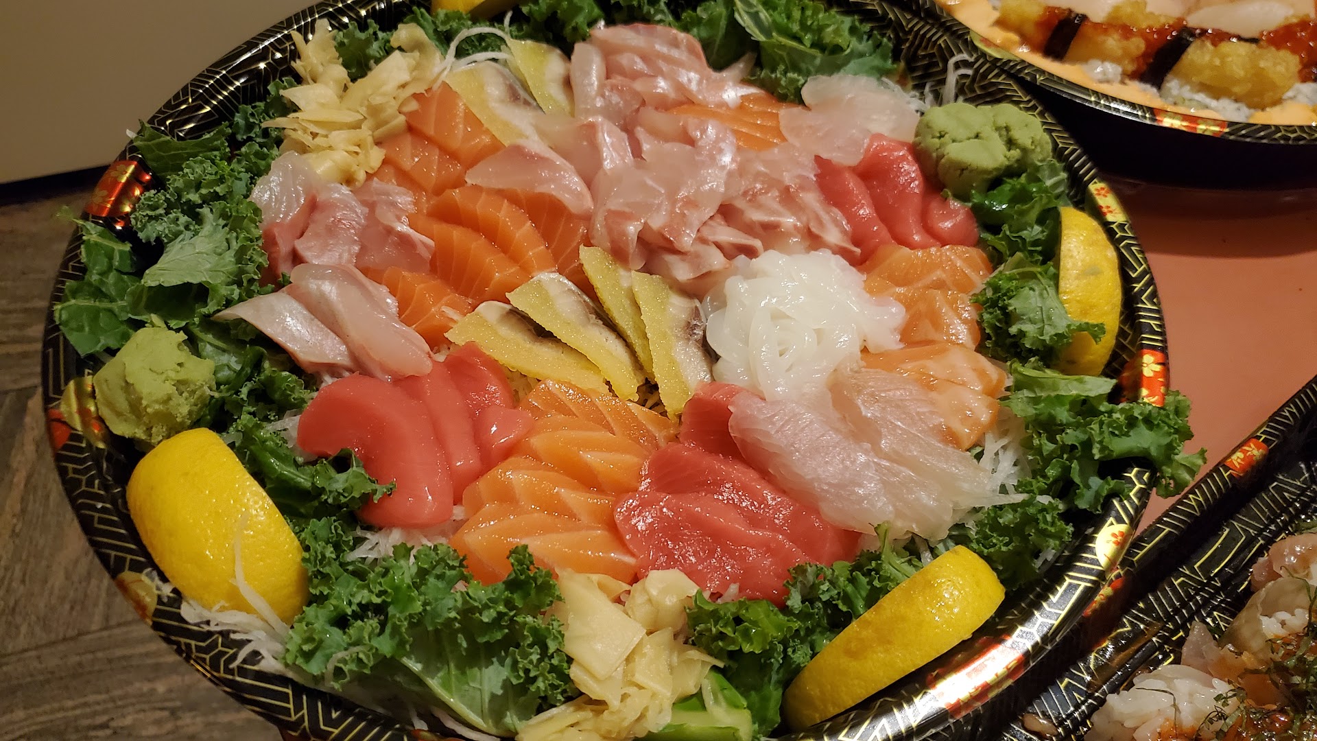 Overall impression- fish isn't the freshest, squid wasn't cleaned properly, and the spicy "tuna" roll was filled with unidentifiable fish This is a medium size platter. Tuna was a bit smelly. The squid wasn't stripped of the tough outer layer and was very tough to eat. The spicy "tuna" roll seemed to be a mash of some white, fishy smelling fish. The other rolls were standard- California roll, shrimp tempura roll smothered in a brown sauce (bbq sauce for eels?), & spicy salmon rolls (identifiable salmon). There were only 3 eel rolls and the restaurant filled up space by adding fried imitation crab stick rolls. Included paper plates, chopsticks, napkins, miso soup, soy sauce, wasabi, pickled ginger, and a small bag of Doritos.