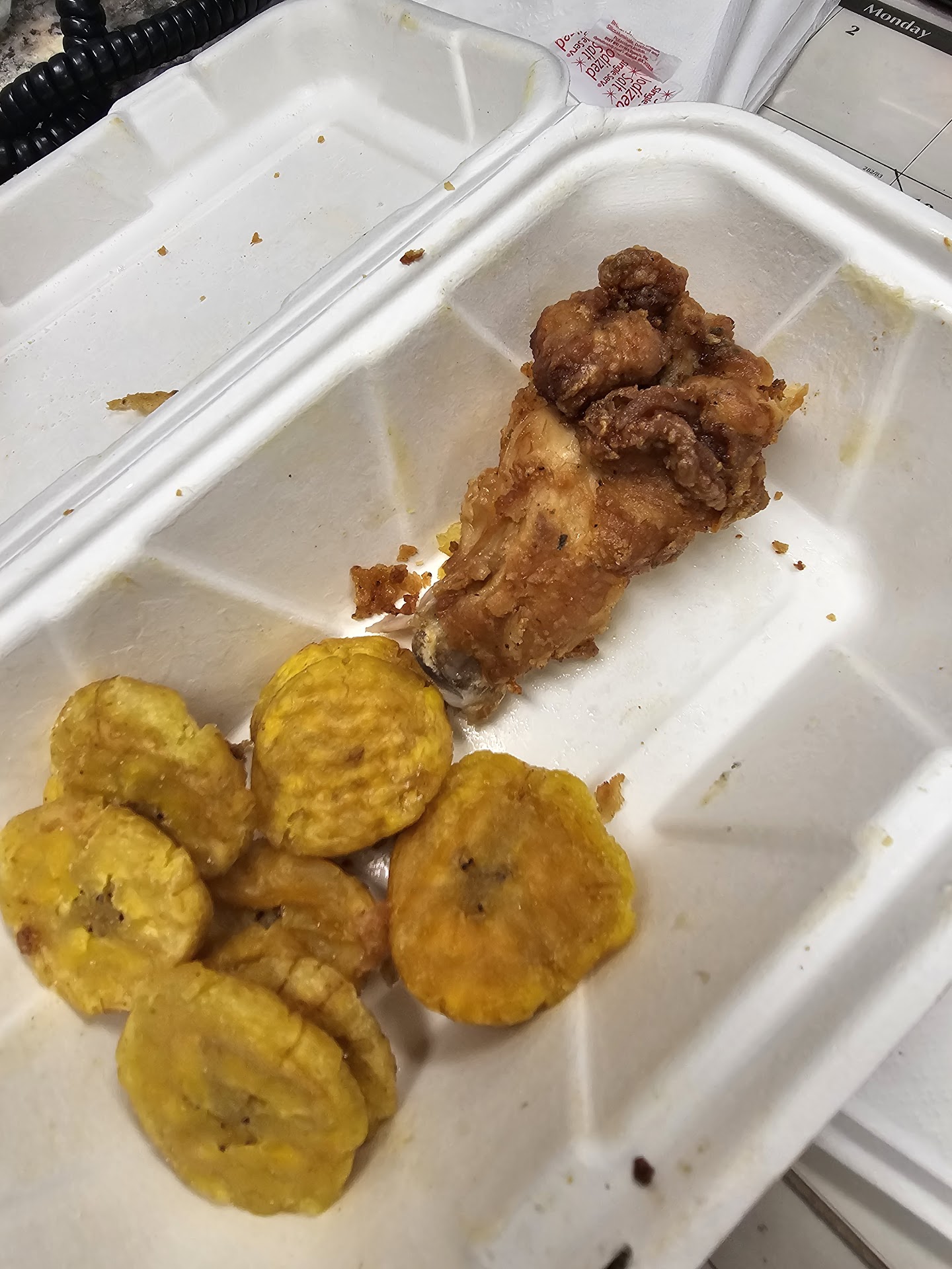 I finally decided to give this place a try. Came in on a Sunday night. The restaurant itself is a small spot. There are a few tables set up to dine in. Most customers came in order and took their food to go. When I came in, most of the food trays were empty. Customers were waiting on fresh chicken, fries, and tostones to be made.
