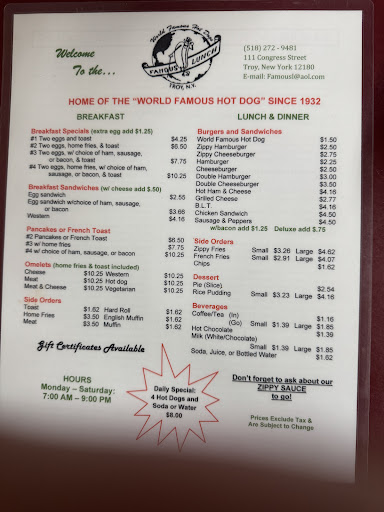 Ā Ā Ā Read moreI was raised in Troy and used to live around the corner from Famous Lunch. The people and the atmosphere are as great as the food. Now I live in FL but I stop at Famous everytime I'm back. I always get four dogs with the works and fries covered in Zippy sauce. The works is composed of mustard, onions and Zippy sauce. A lot of onions.