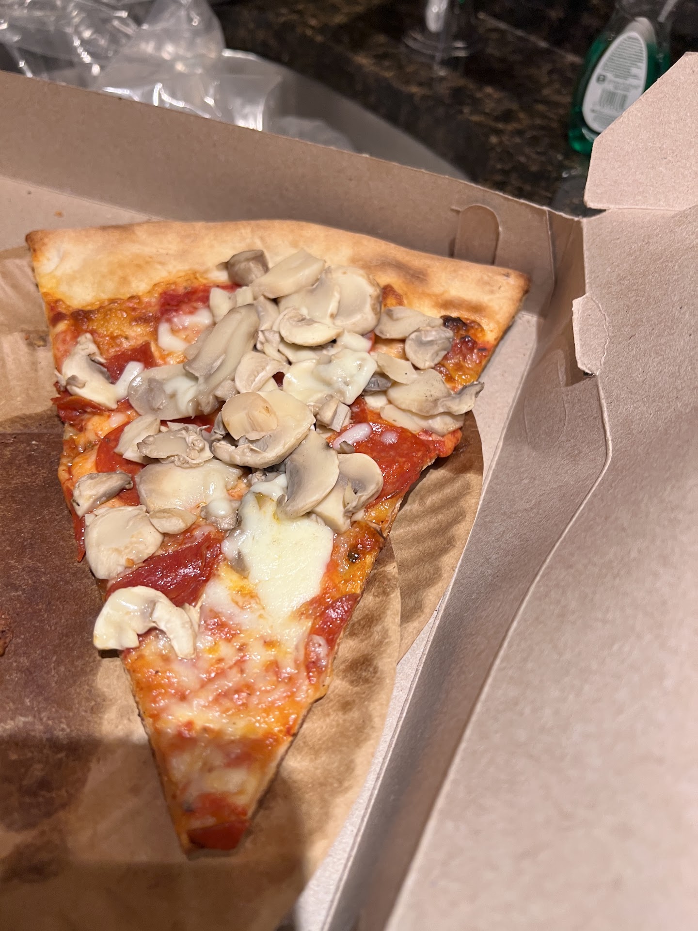 We ordered one cheese slice, and two slices of pepperoni and sausage. Looking at the pictures what do you think this is? Looks like they took a can of mushroom slices and dumped it on top of the pizza after it was already cooked to disguise the fact the sausage was missing.